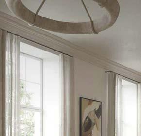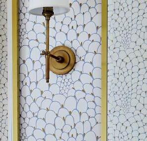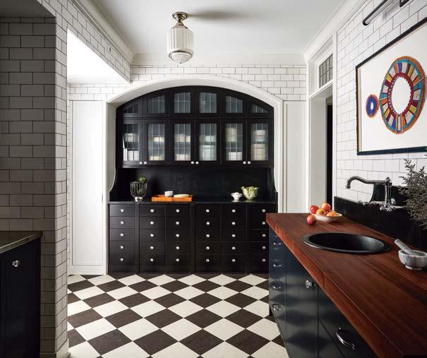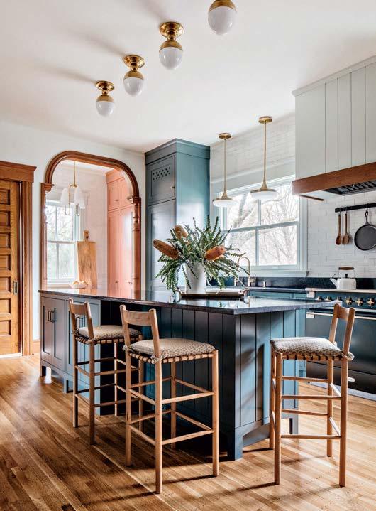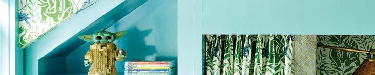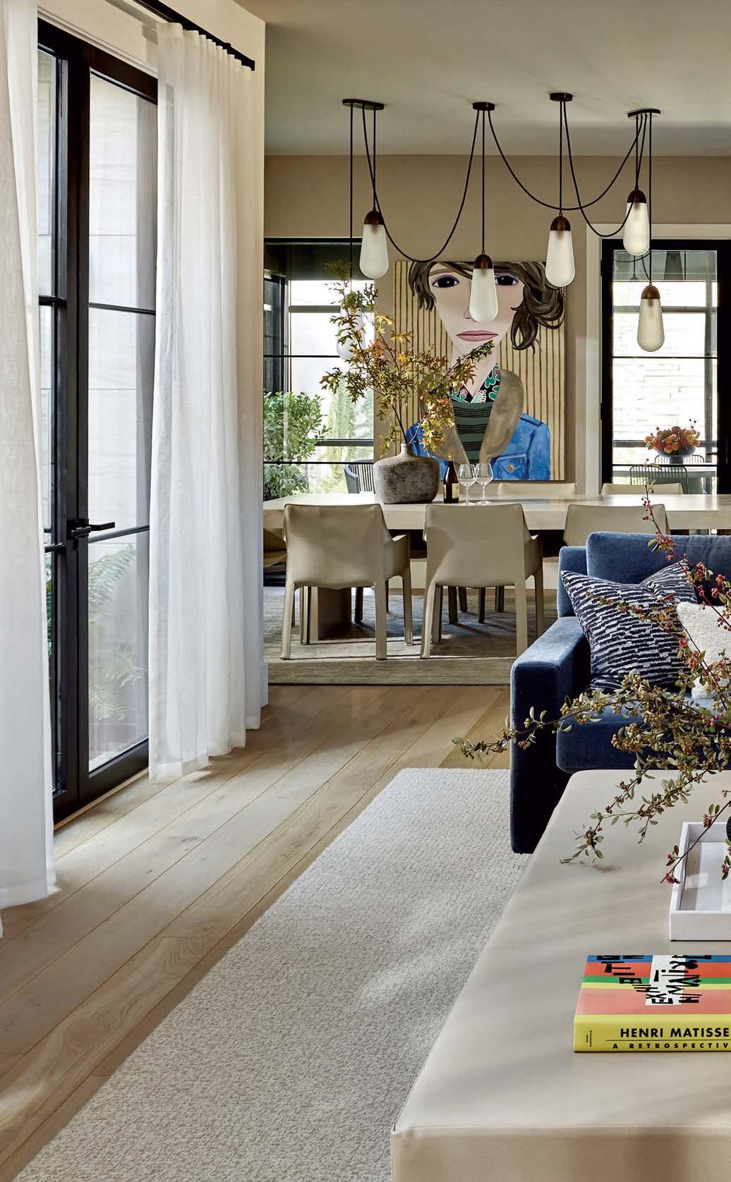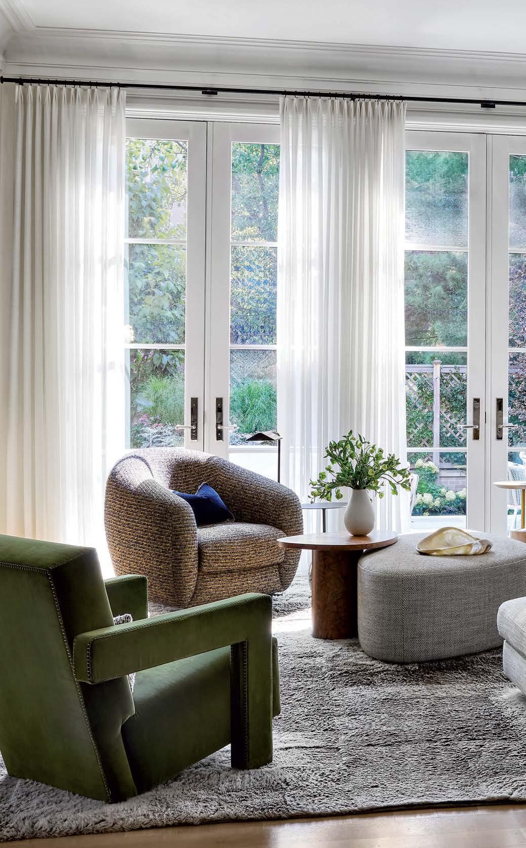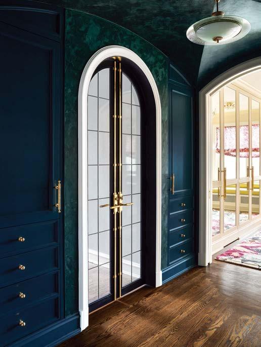 Just as much thought went into the children’s rooms, which were designed to age with them. One daughter’s room, for instance, boasts patterned taupe wallpaper and elegant ballerinapink draperies tied with Victorian-inspired tassels. “In a traditional house, those tassels are typically seen only in the living room,” Horner notes. The vintage-inspired canopy chair feels right at home in a room full of romantic and rosy accoutrements, topped by a floral crown chandelier that may as well have been plucked from a fairy tale.