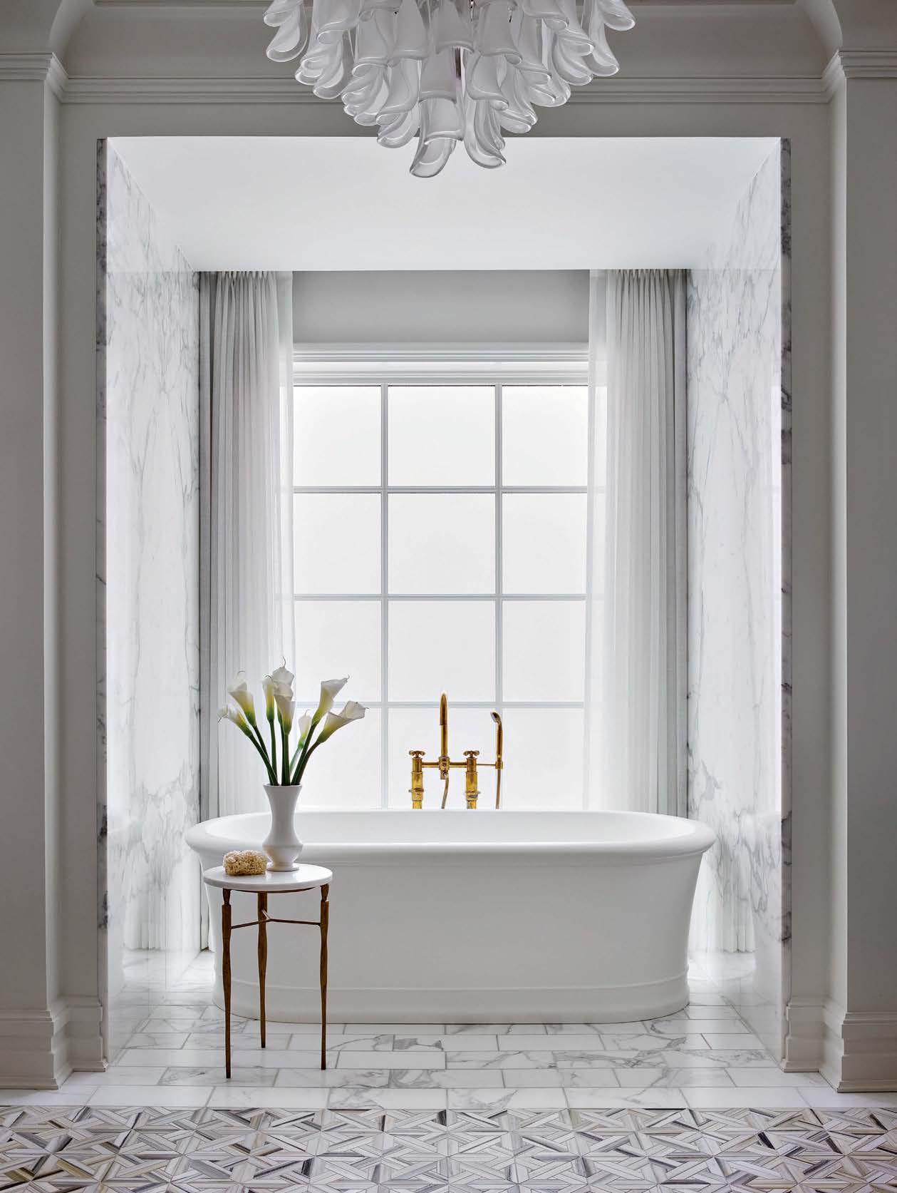 Opposite: Calacatta Gold marble from Marble & Granite Supply of Illinois surrounds the primary bathroom’s Devon&Devon tub, joined by a table from 1stdibs. A Wired Custom Lighting glass chandelier suspends above Ann Sacks’ Calacatta Zebrino tile.