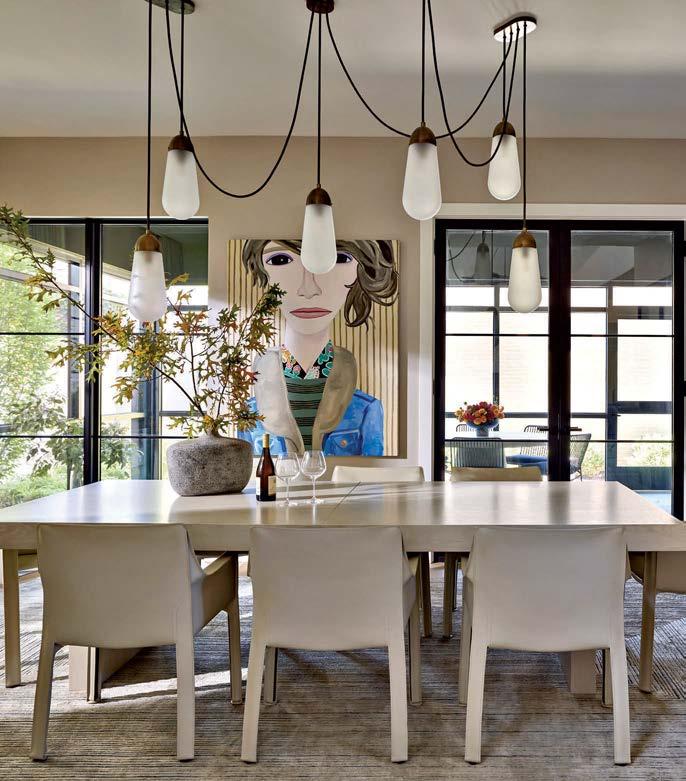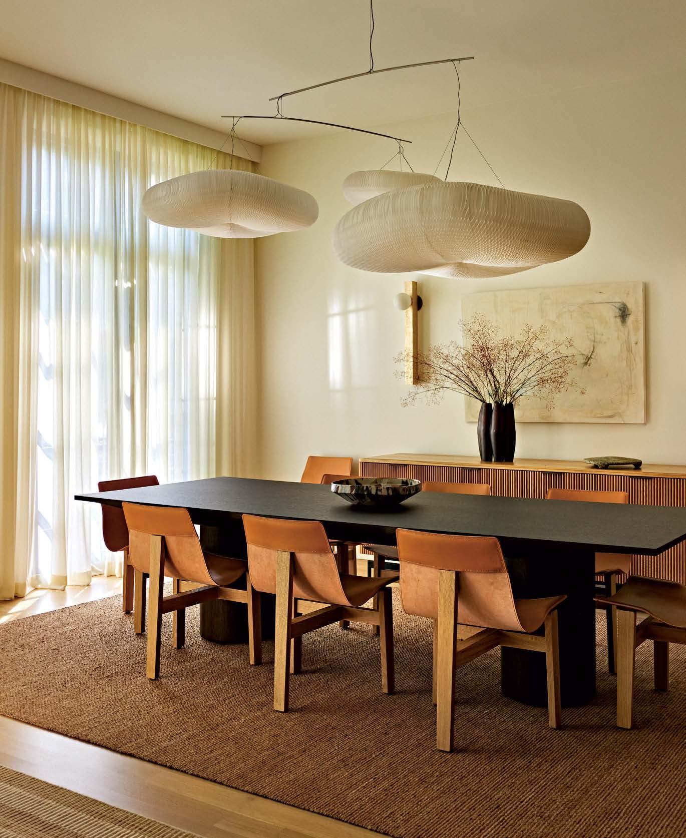 Opposite: The star of the dining room is the cloud-like Molo pendant, whose paper shades spin freely. They float above an Acerbis table, Angelo Mangiarotti chairs and a Perrine Paris rug. Beside the Darwin Fitz artwork is a John Sheppard Studio sconce.