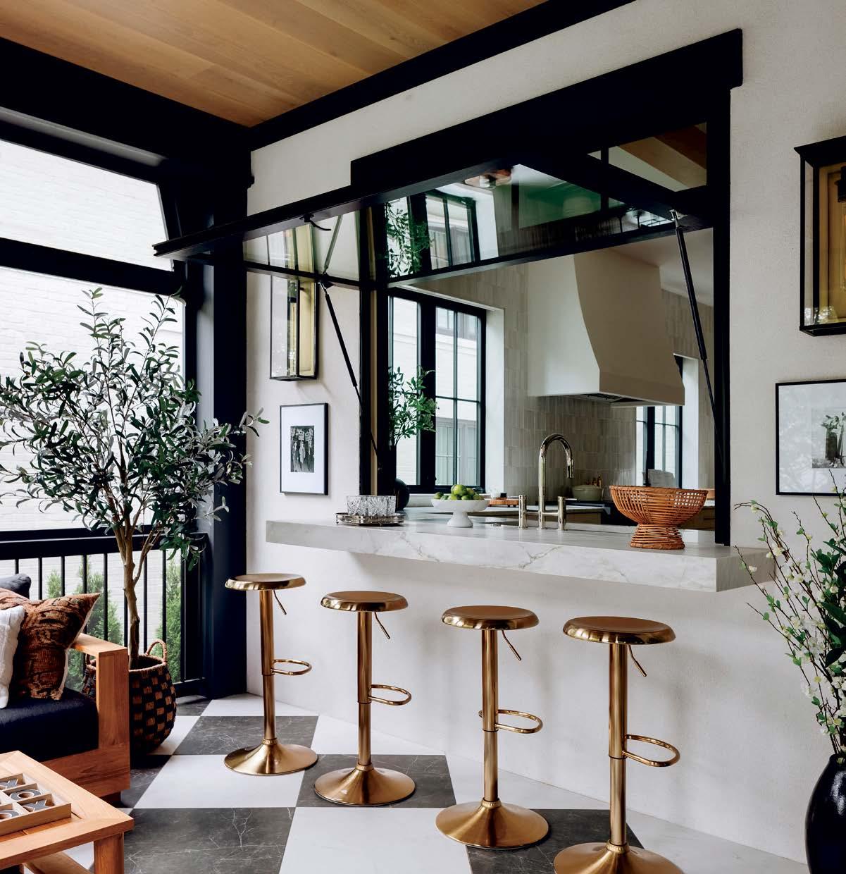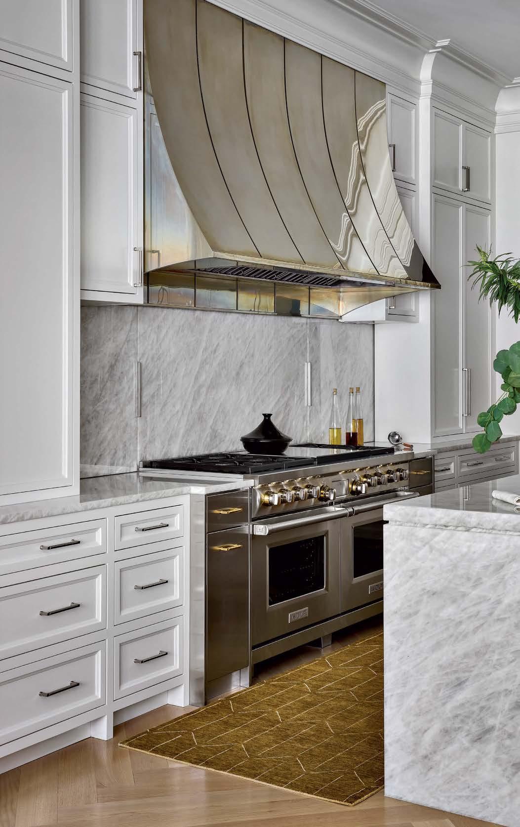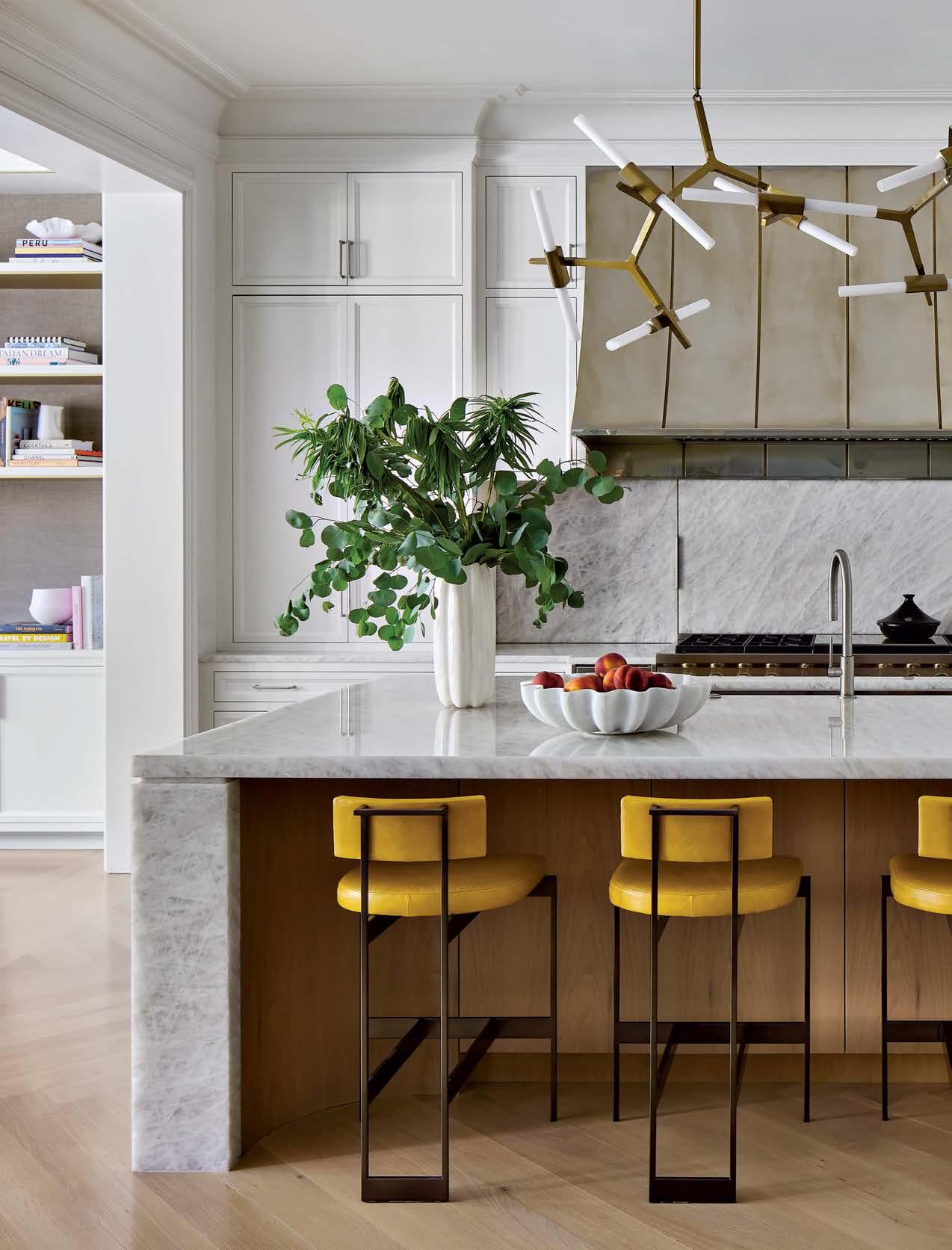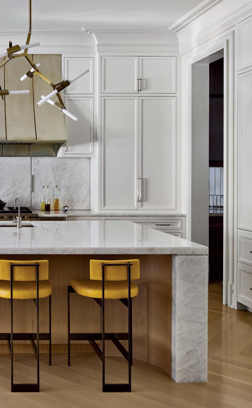 chandelier complements the kitchen’s stainless steel hood with brass detail fabricated by Mitchel and Mitchel. The Iceberg Belissima quartzite island is lined with Powell & Bonnell stools in Keleen Leathers upholstery.
