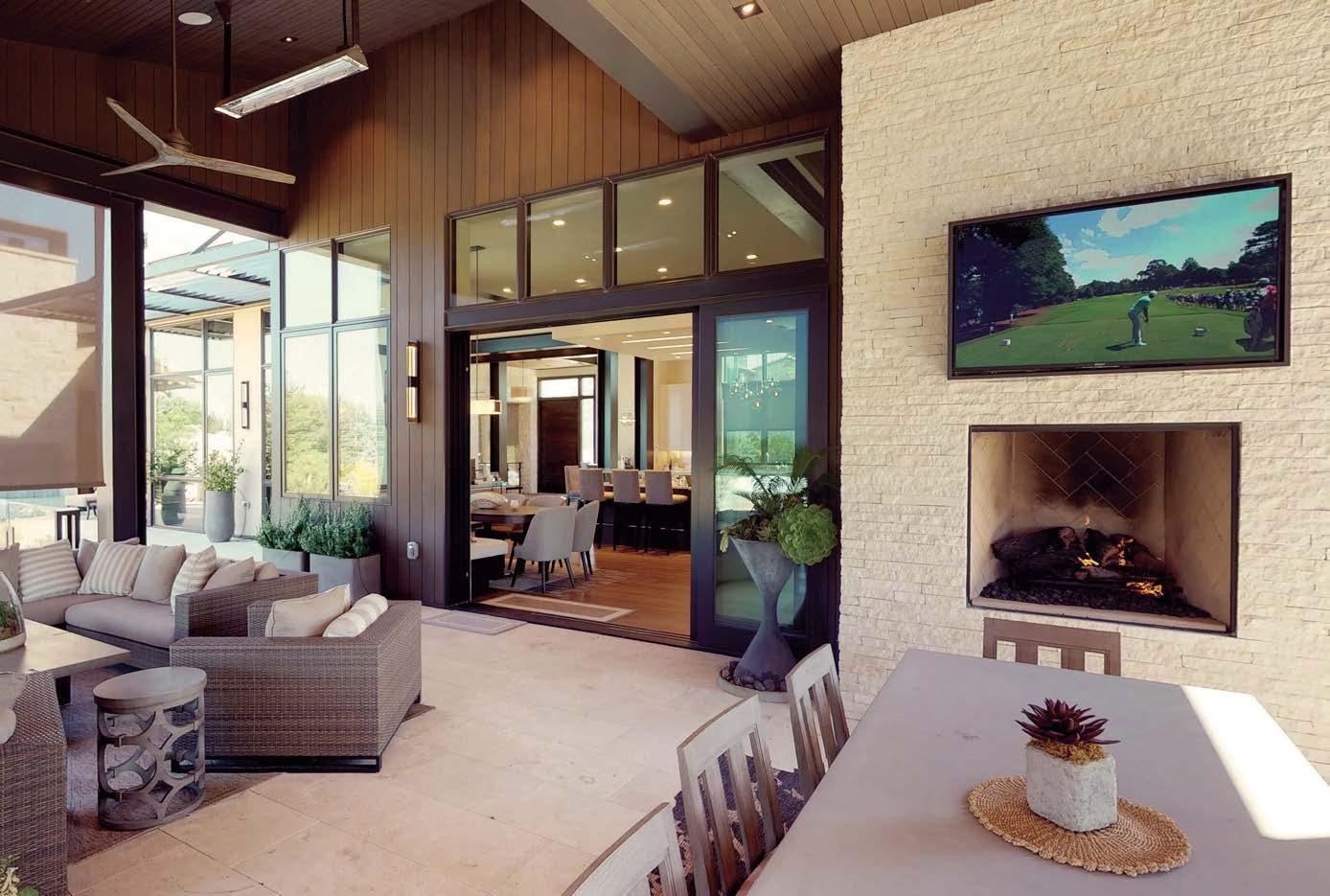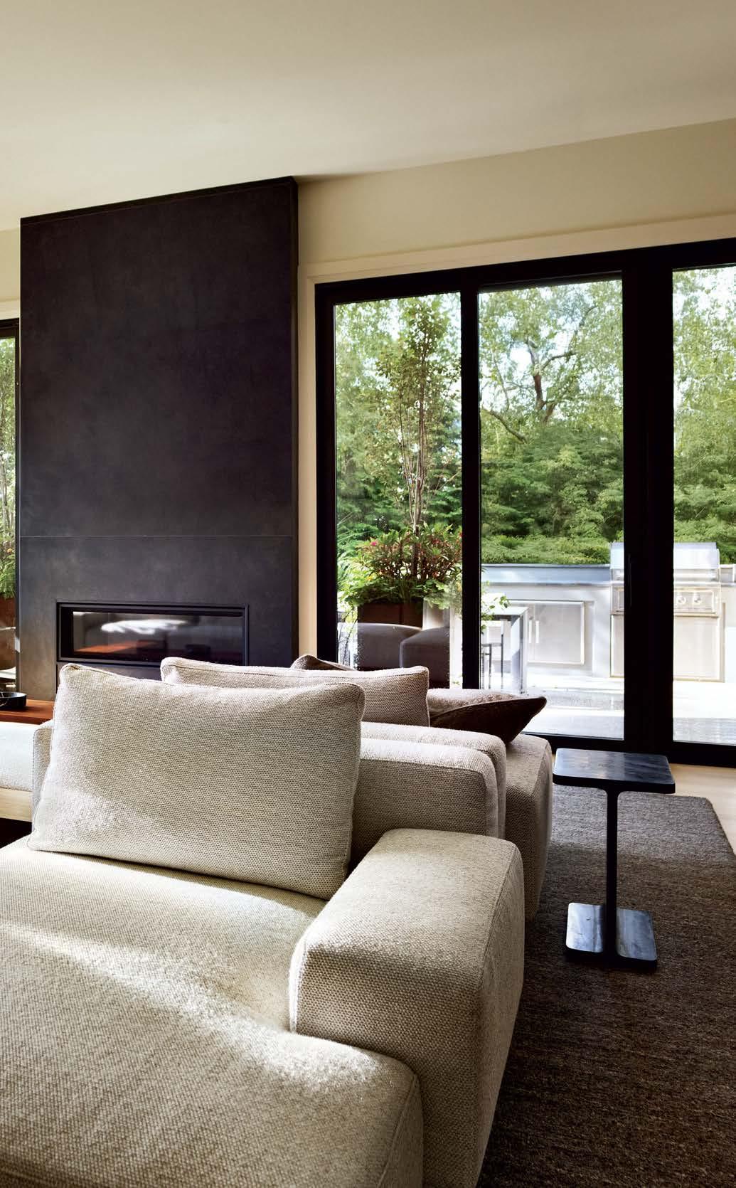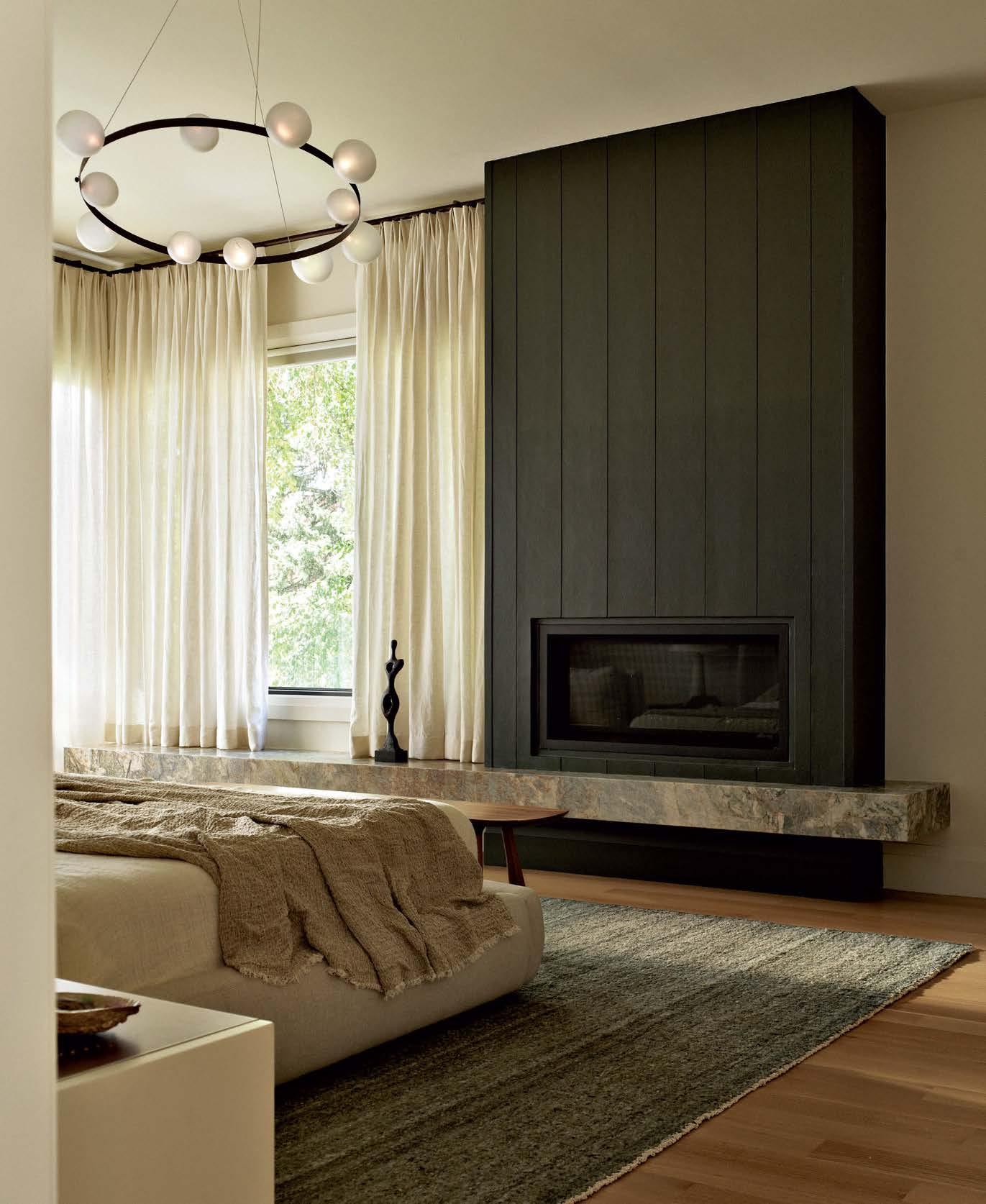 What makes the home a great place for all are the spaces where members of the family can retreat or gather. For the parents, the primary bedroom is a calm, adults-only haven that includes a muted, creamy color palette and a cozy fireplace whose floating hearth runs underneath an adjacent window, offering a place to perch and gaze outside. The glass-wrapped family room, on the other hand, features a large, double-sided sofa with one side designated for reading and the other facing a screen so everyone can enjoy movie night.
