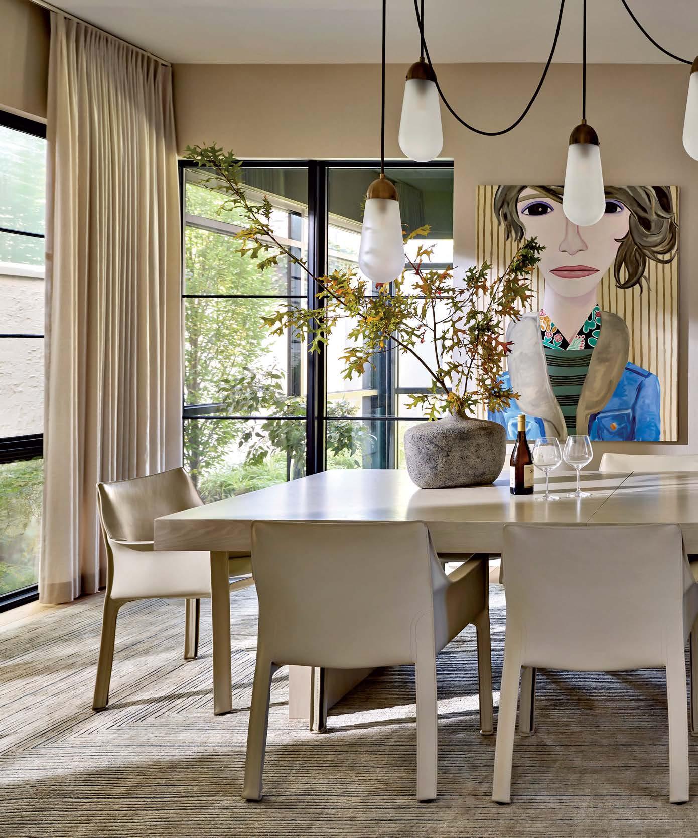 Brian Calvin’s Pinch surveys the dining area, furnished with an oak table by Urban Craft Custom Upholstery, leather Cassina chairs and a wool-and-silk Kravet rug. Casting a glow from above is an Apparatus fixture. The wallcovering is a textured fabric by Carlisle & Co. for Holly Hunt.