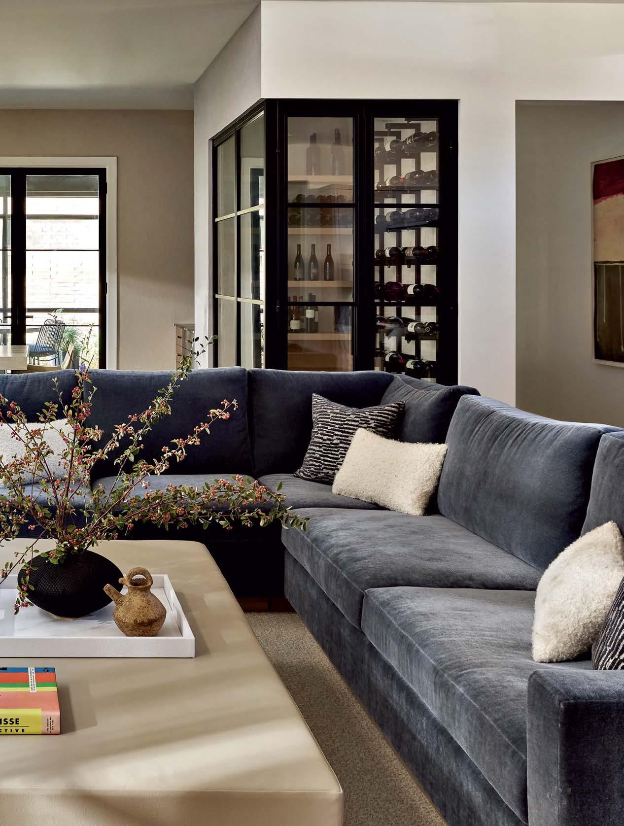 Dufresne and designer Natasha VanScoyoc collaborated on the wine room, accessible from both the dining and living areas. In the latter, a sofa in an Opuzen mohair and a coffee table in a Holly Hunt faux leather rest on a Lee Jofa rug.