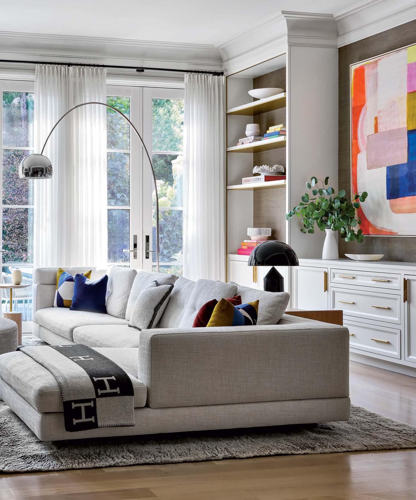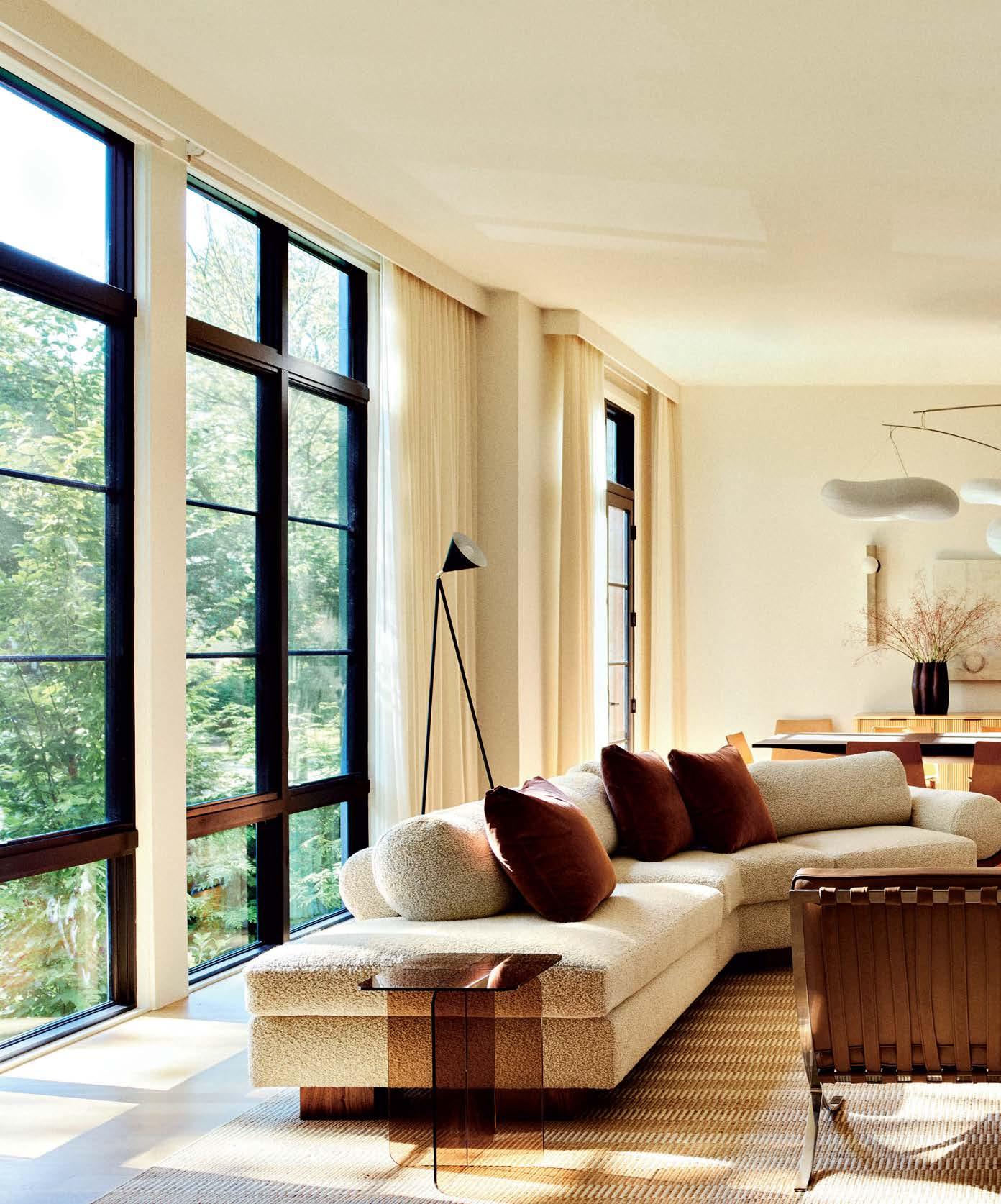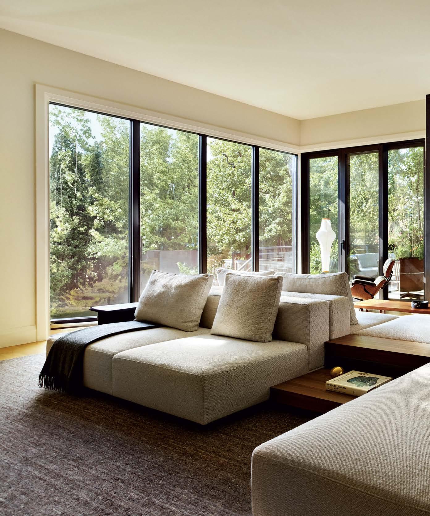 The family room’s Molteni&C double-sided sofa is the perfect spot to soak in the views through the windows by Weather Shield Windows & Doors. Underfoot is a rug from Oscar Isberian Rugs, and the floor lamp is by Noguchi.