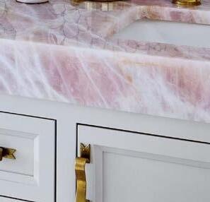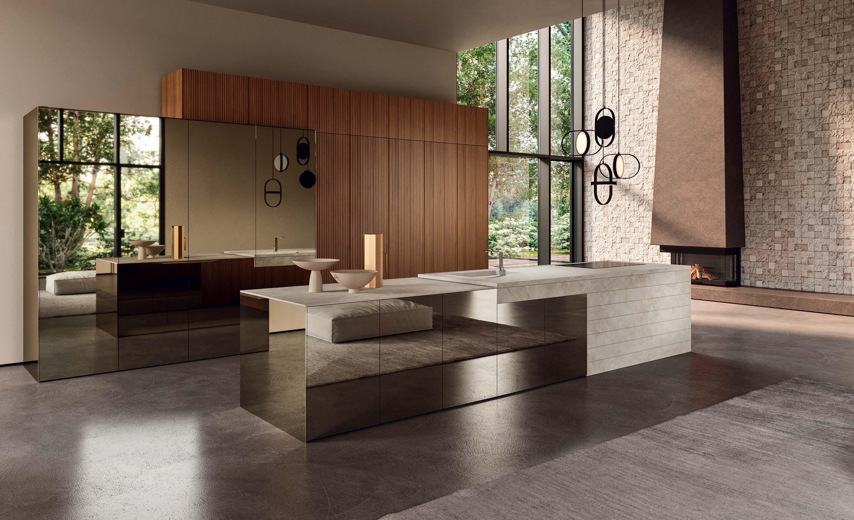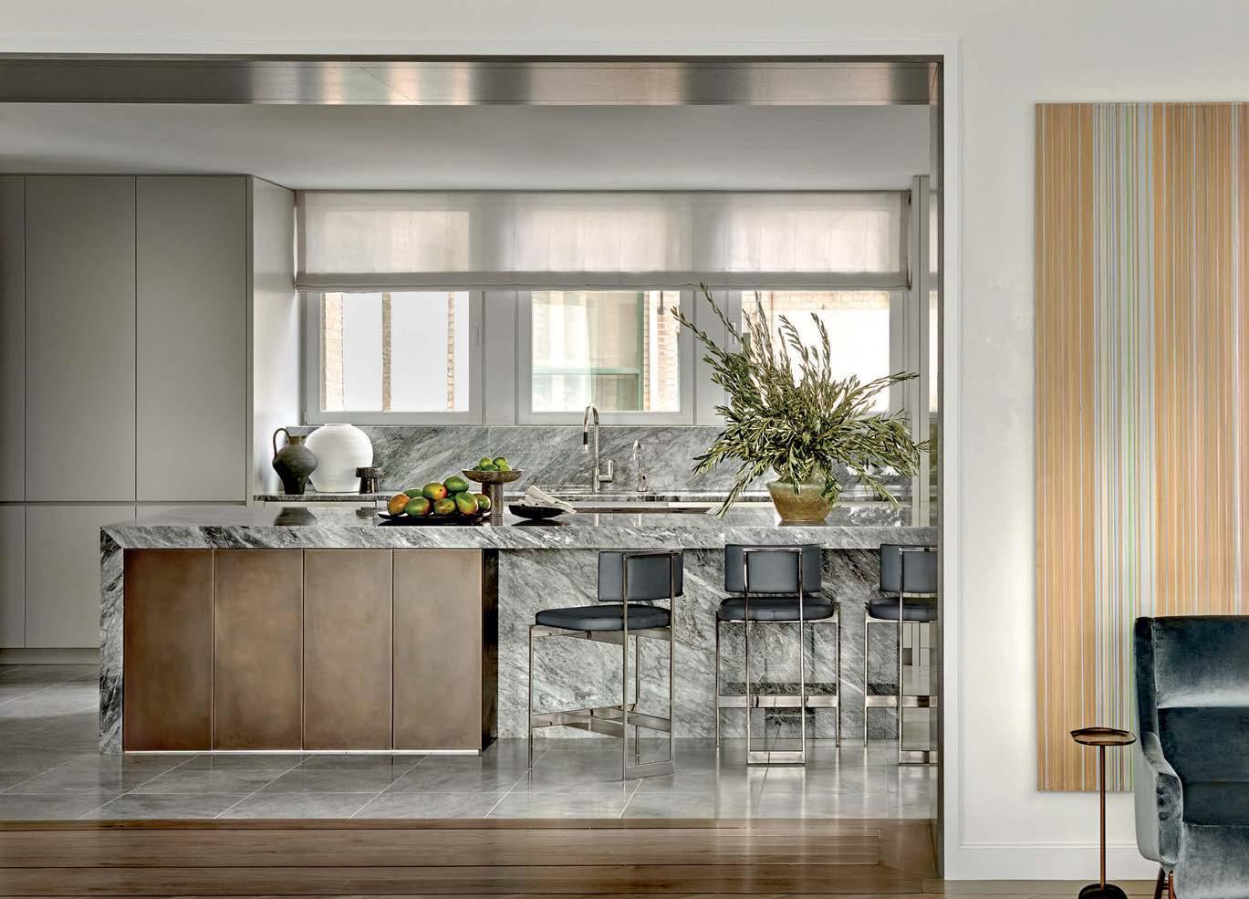He accessorized the kitchen with a molecular bronze-and-glass fixture that gleams alongside a stylish stainless steel hood. The wife loves to cook and wanted to avoid clutter, so the space needed to be functional yet sleek. Iceberg Belissima quartzite forms an island with the slightest reveal between the top and base for visual interest. The stone appears again as the range backsplash and its adjoined telescoping doors, which open to reveal shelves lined with spices.