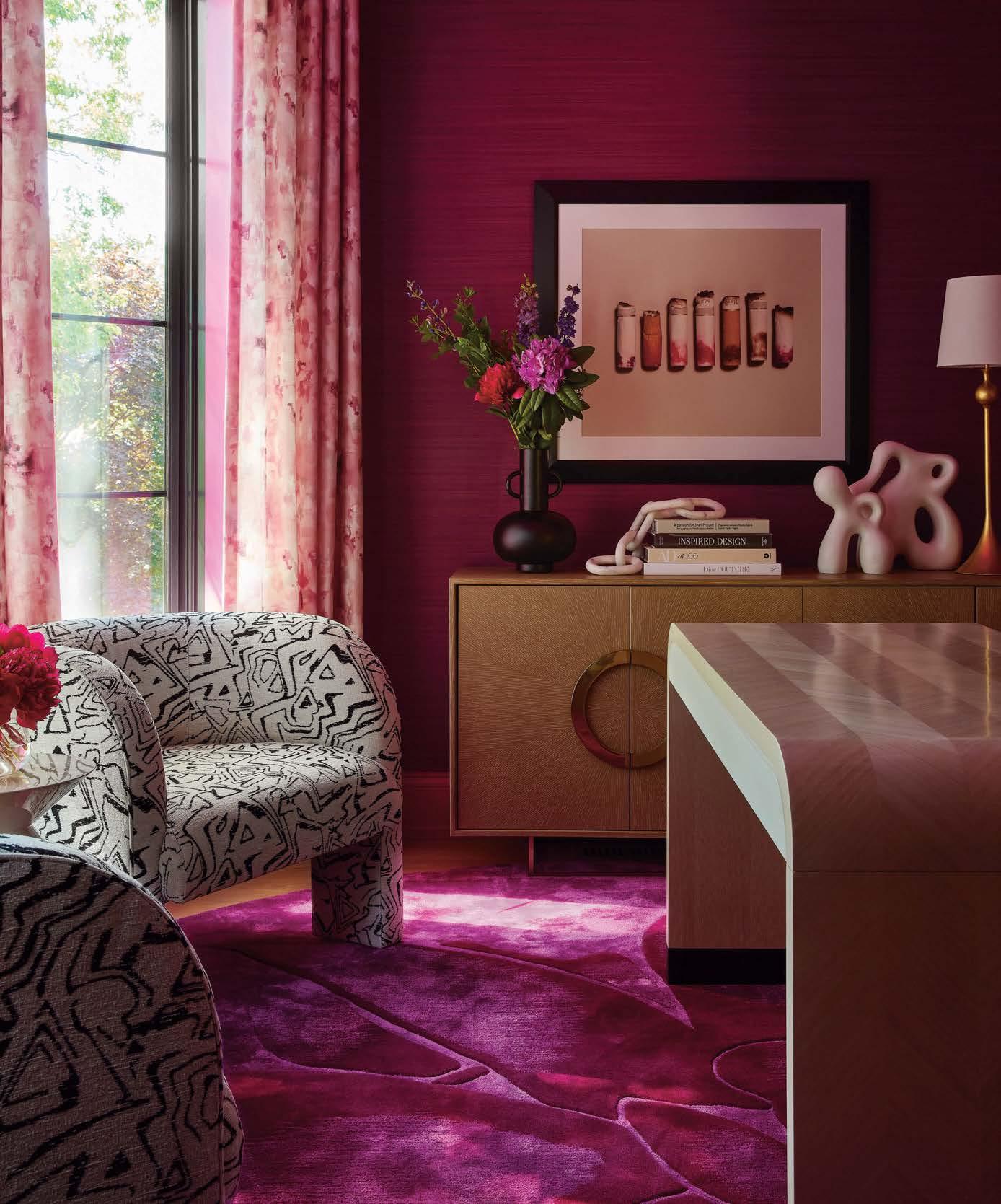 Opposite: Barron Custom Furniture chairs in a Pollack fabric encircle the Hudson Furniture dining table. Andrew Holmquist artwork, backed by a Phillip Jeffries wallcovering, and a John Pomp chandelier energize the space.