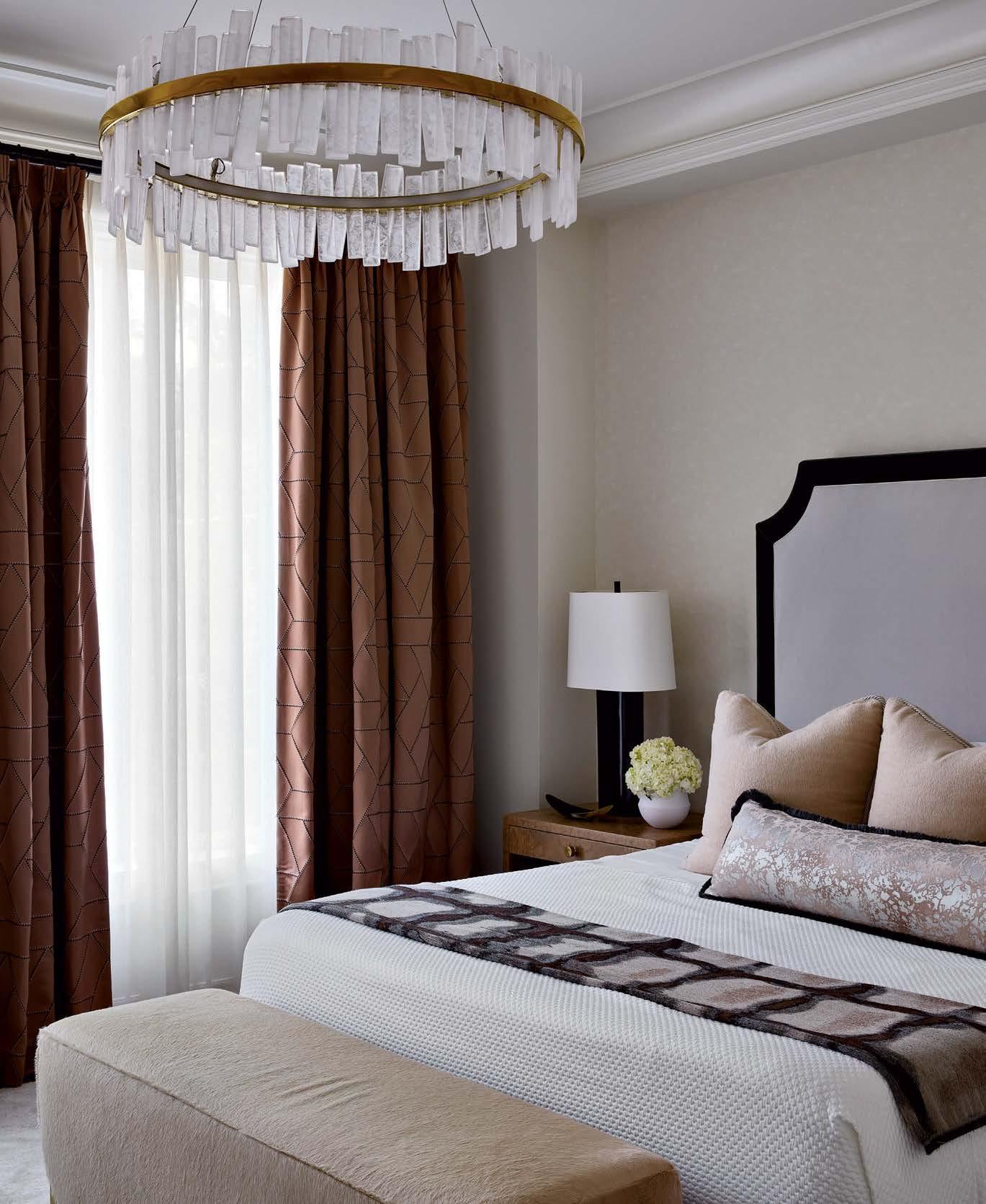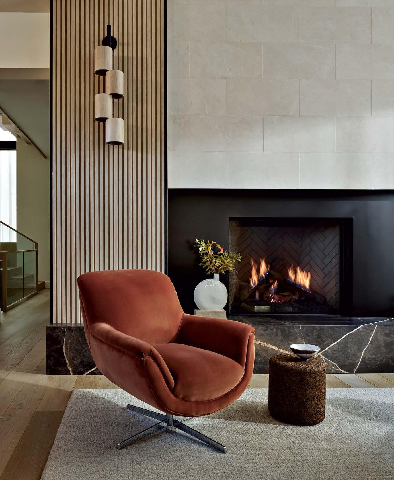 At first glance, the palette seems neutral, but closer inspection reveals the spaces are nuanced with contrasting colors and a rich textural mix. “The wife came to me with the idea of using a rust hue—the color she is most drawn to,” Taylor says. “Throughout the house, you find shades of that color, as well as dark metals and warm walnuts, to enliven the rooms.” She also selected pronounced textures—richly veined stone, soft velvets and buttery leathers—to add visual and tactile excitement. “A palette that’s too monochromatic can fall flat,” Taylor explains. “We worked to provide dimension through texture.”