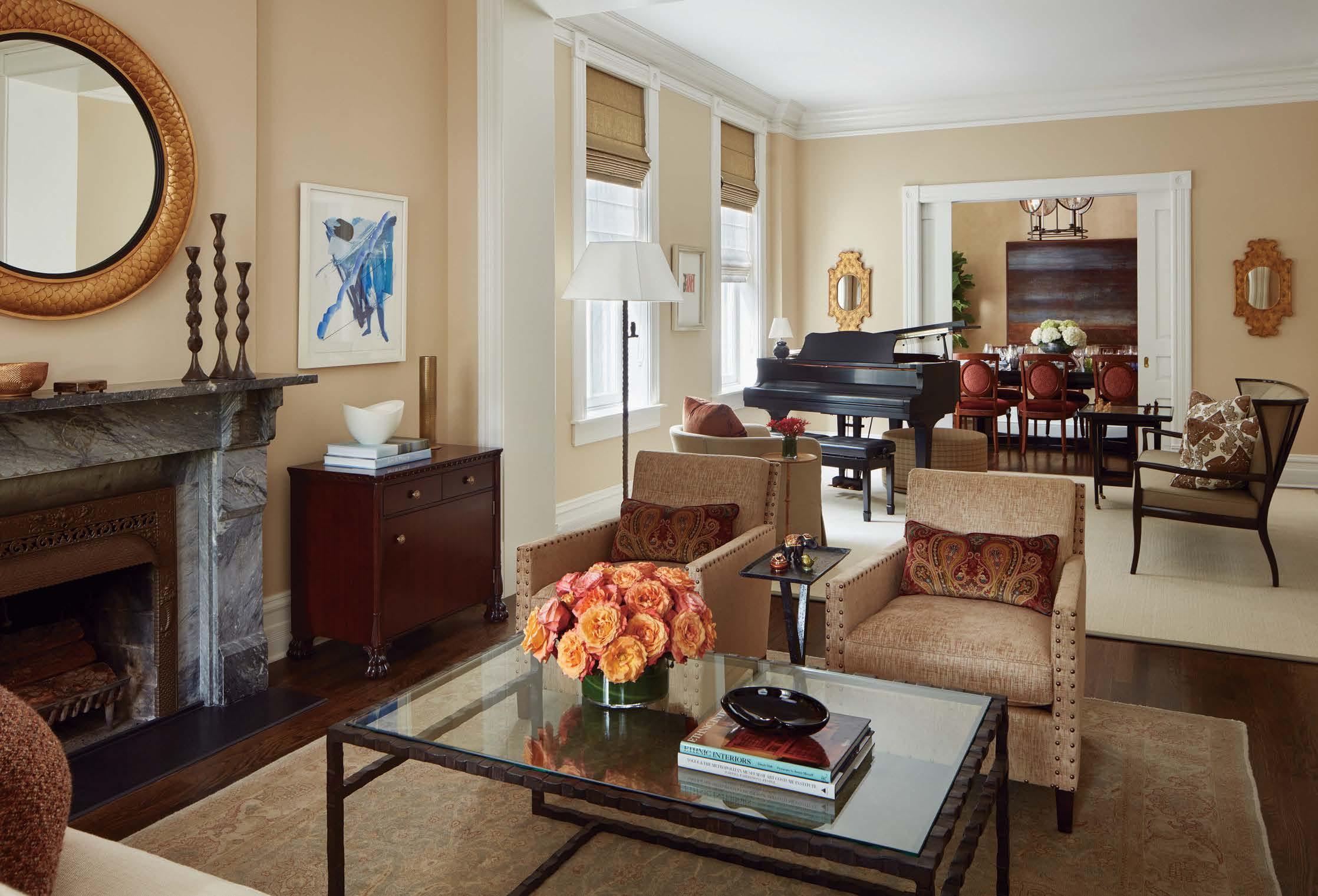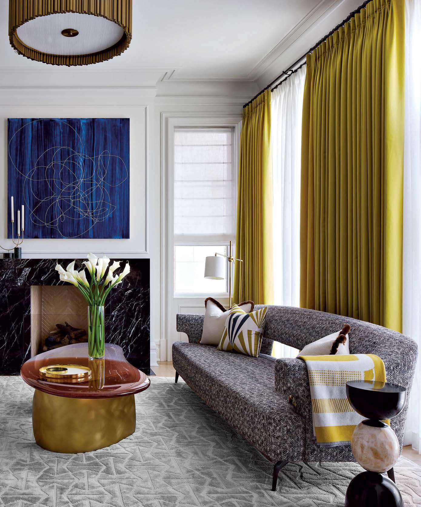 Previous page: An Elliott Puckette artwork is mounted over the living room’s Anatolia Black marble mantel. The chairs, sporting a de Le Cuona fabric, face a Holly Hunt sofa. Dedar overdrapes match Wired Custom Lighting’s Georgia fixture above John Pomp’s Tidal table.
