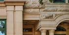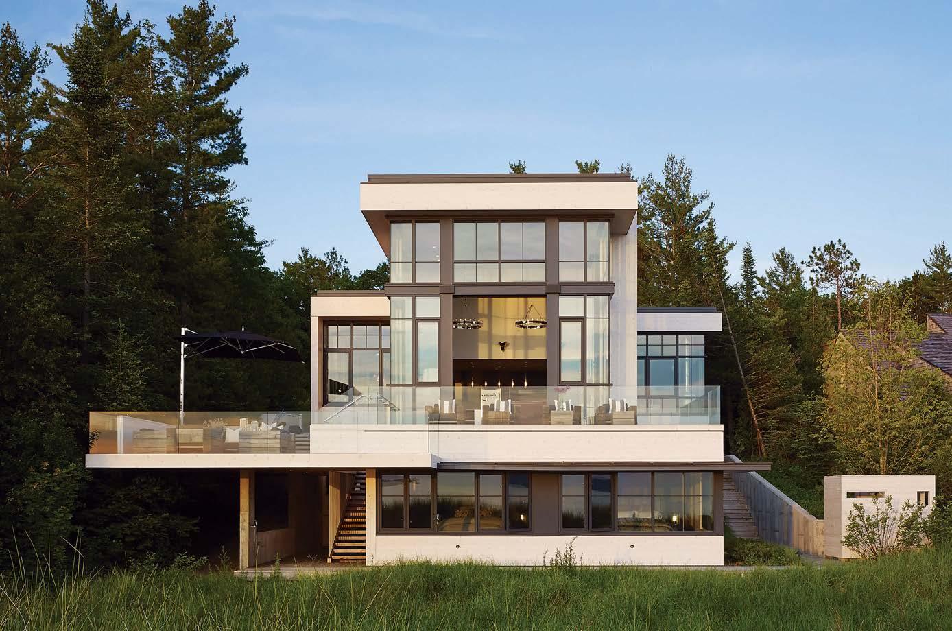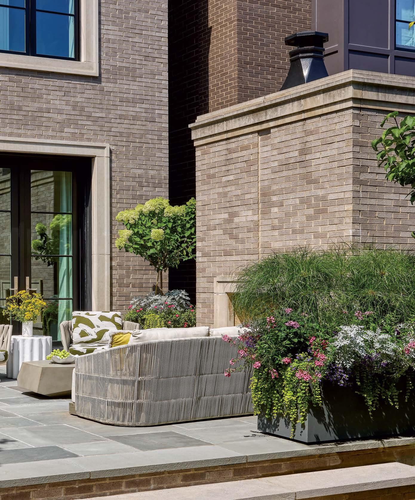 Dufresne’s approach created a variety of planes on the façade, which allowed a mix of textures in a “soft, clean palette,” he notes. As a nod to the city’s architectural history, he used limestone on the front of the first floor and an Italian terra-cotta tile that emulates a brick pattern on the second. Dark metal punctuates the front of the house and appears more prominently on its sides. The result, Dufresne says, is “timeless, not boastful.”