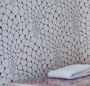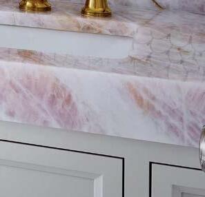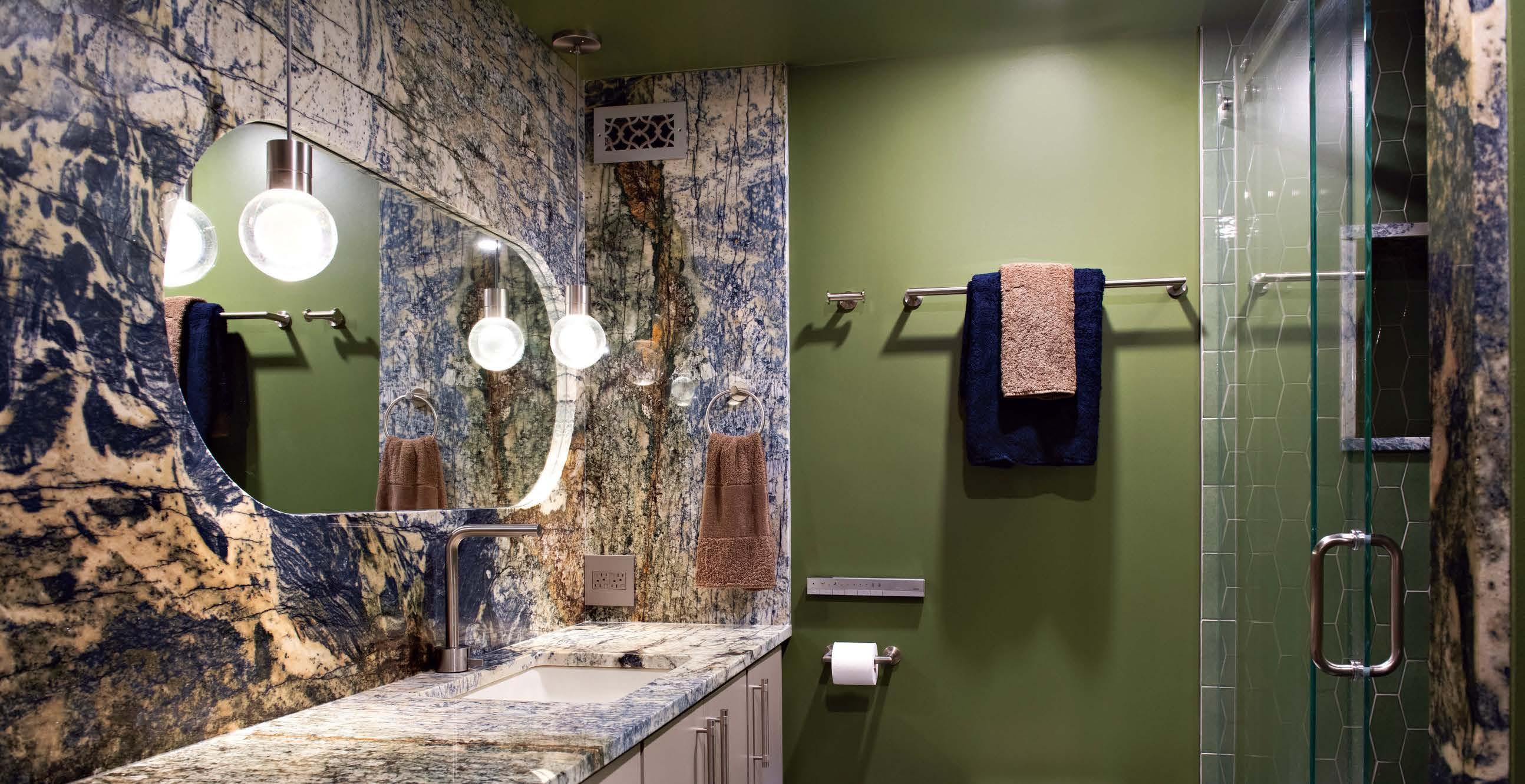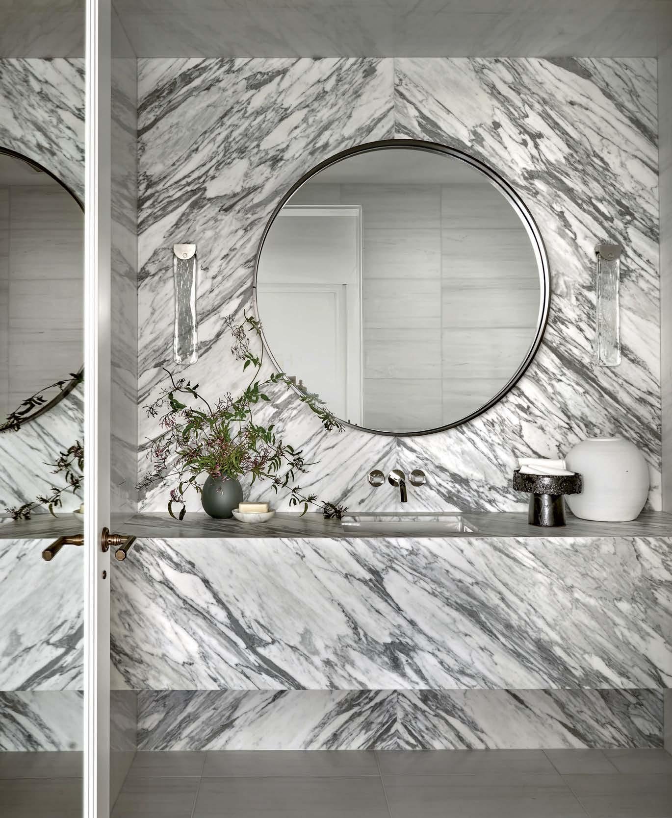 bench clad in boldly veined leathered marble, both from Artistic Tile. The wood sconce is by Allied Maker.