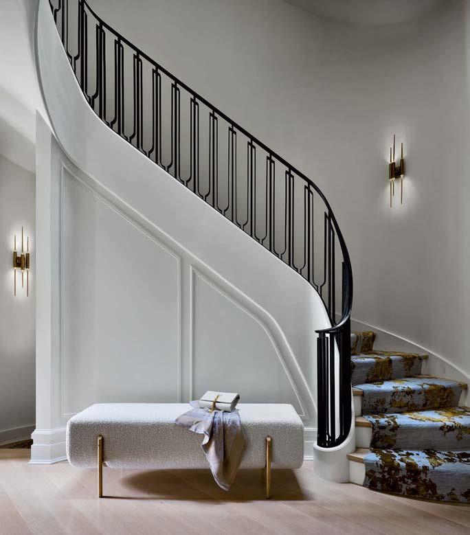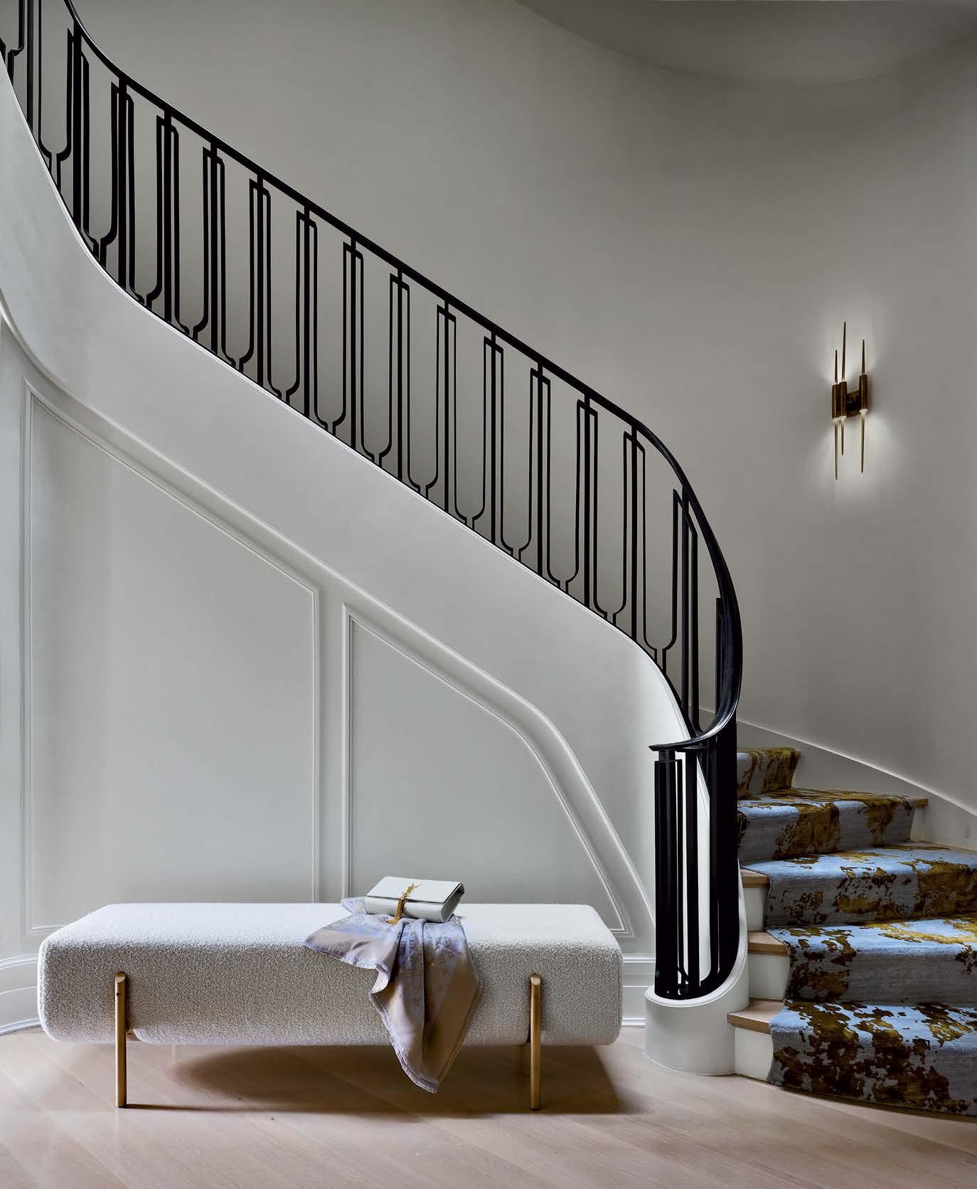 Enveloped by Benjamin Moore’s Dune White, the elegant staircase features a wool-and-silk Shiir runner. Holly Hunt’s Four Seasons sconce illuminates the space, and the brand’s Great Plains material adorns Natasha Baradaran’s Sempione bench.