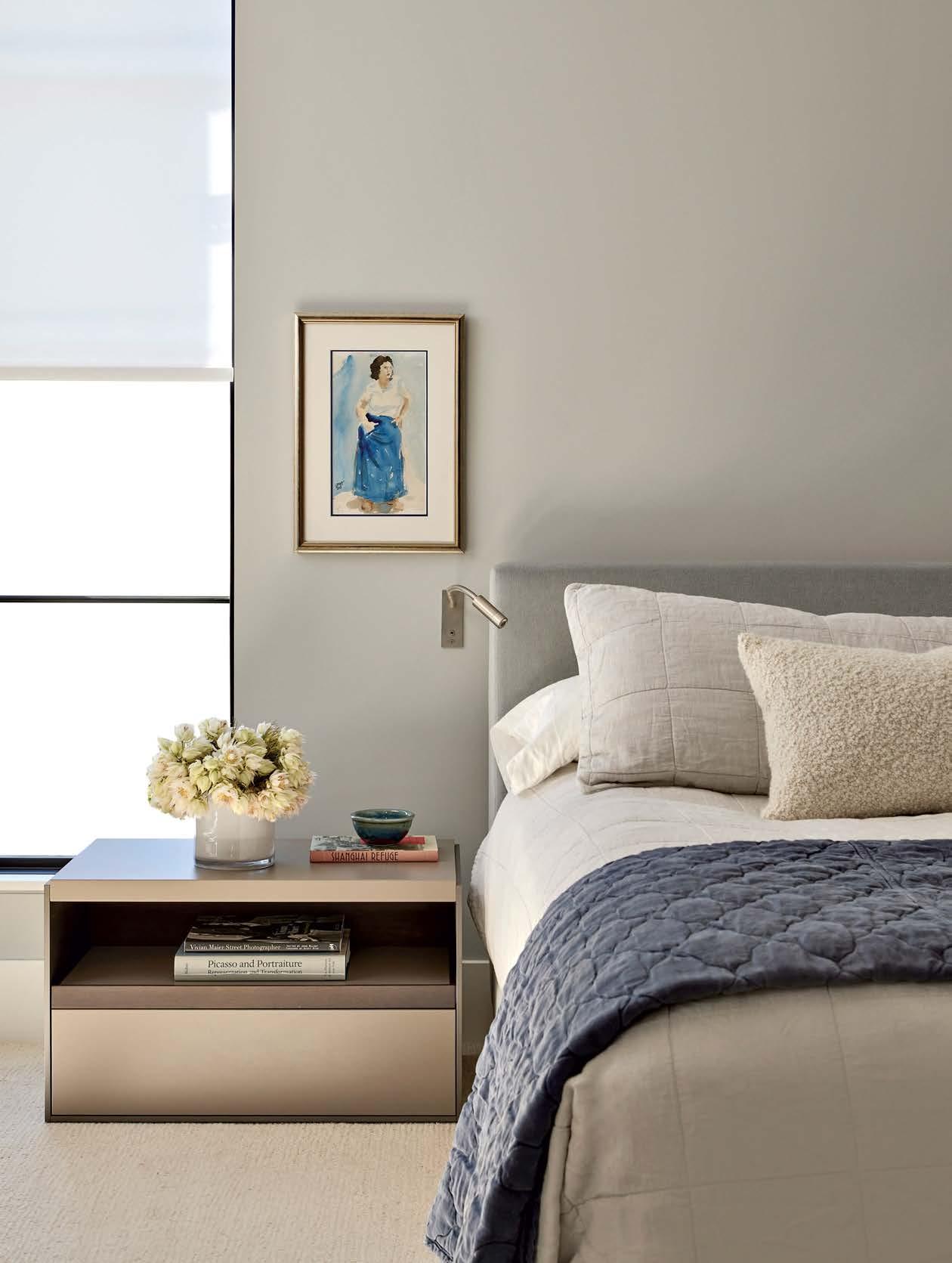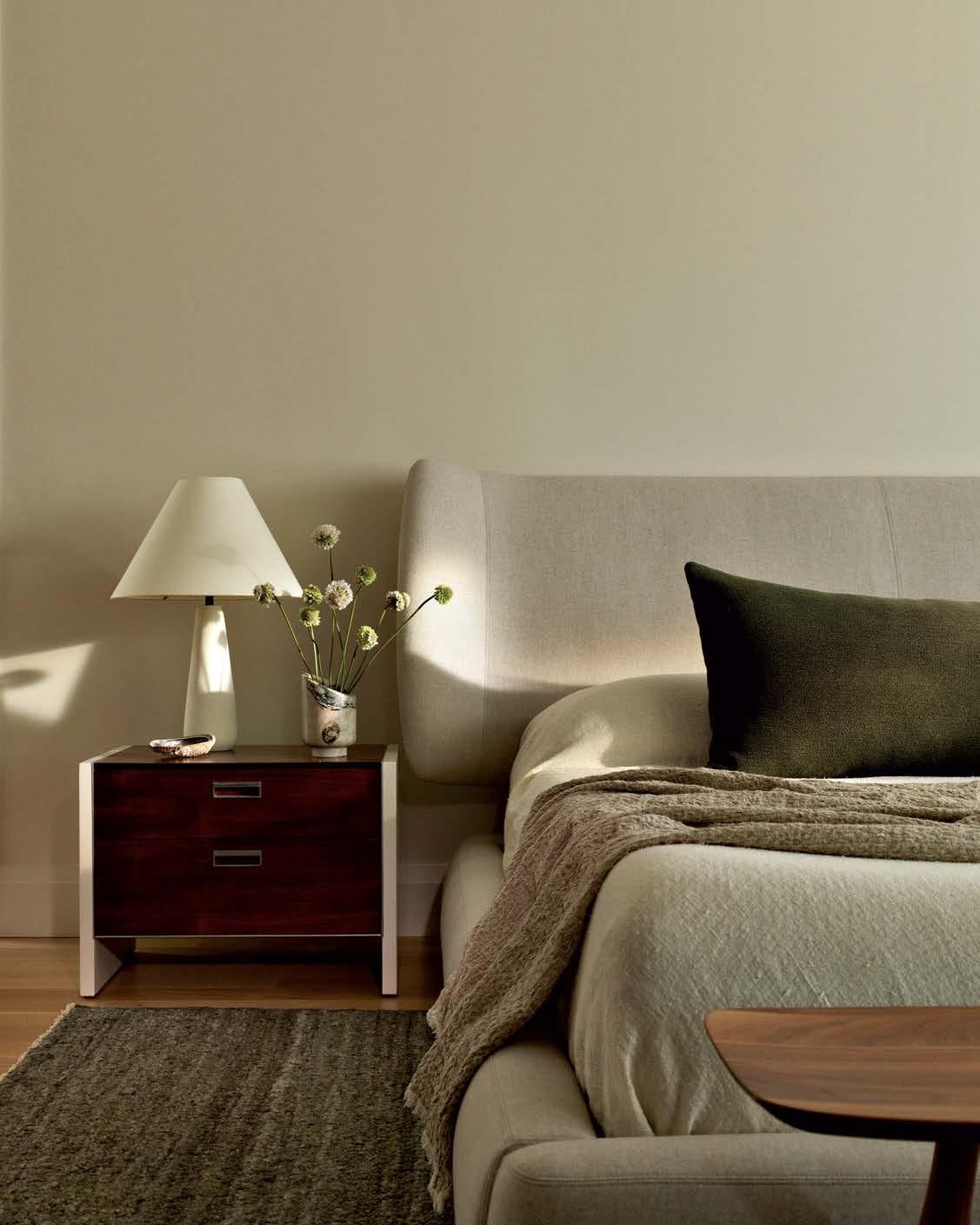 Opposite: A clean, comfortable aesthetic extends to the primary bedroom, which is tucked away from the street. Holly Hunt mohair covers the Urban Craft Custom Upholsteryfabricated bed, while a flexible Astro Lighting wall light from Lightology offers an unobtrusive source of illumination.