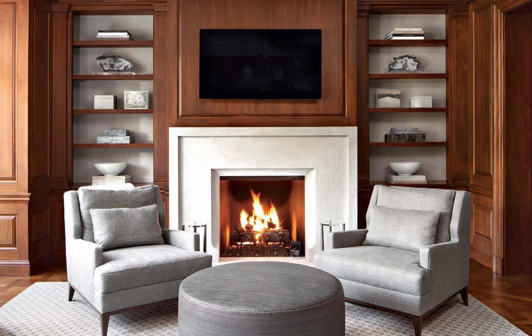 Just as Dufresne and VanScoyoc combined their talents, so did VanScoyoc and designer Amy Kartheiser. Both worked on the home’s hard finishes, notably on the choices for the living room fireplace in a mix of marbles. Kartheiser also selected furnishings—and, with the exception of the living room’s rust velvet lounge chairs and blue mohair sectional, most are in a range of neutrals. Creamy shades abound on the leather dining chairs, oak dining table, dimensional wallcoverings and plush carpets. For Kartheiser, whose portfolio leans more colorful, there’s a lesson to be learned: “Homes can be just as gorgeous in a neutral palette, but texture makes them stand out,” she notes.