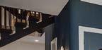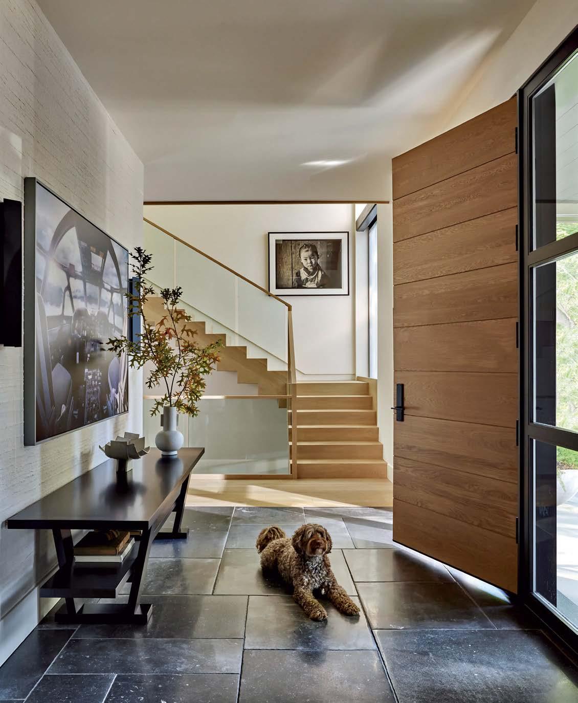 Previous page, right: The clients’ mini labradoodle, Louie, lies on the foyer’s Exquisite Surfaces porcelain tile flooring. A Luis Gispert photograph rests against a Phillip Jeffries-covered wall, and a Lisa Kristine photograph hangs in the stairwell.