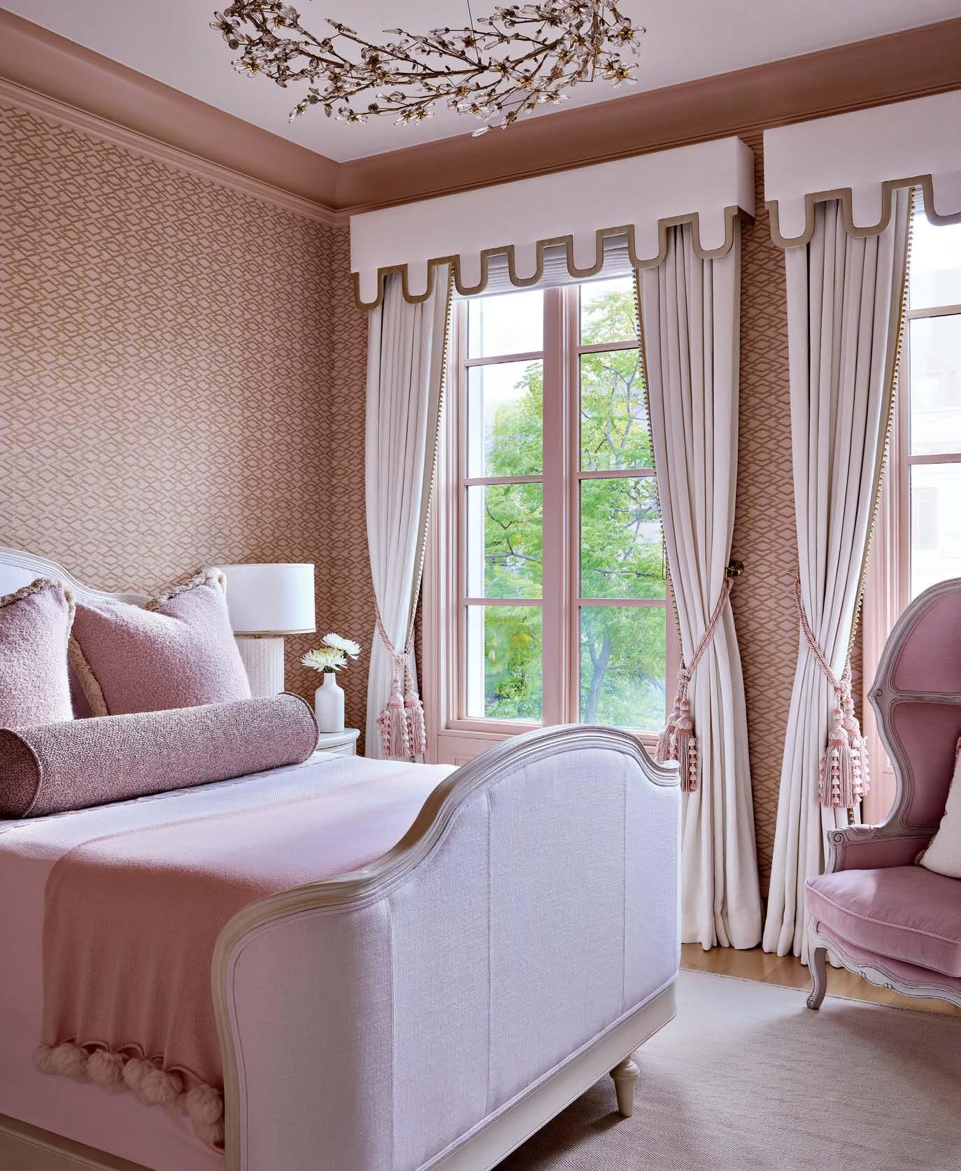 Opposite: Pretty in pink, the daughter’s bedroom is clad in a geometric silk wallpaper by Jane Churchill. The RH bed, chair and crystal pendant exude fairy-tale romance. The cornice and draperies are made of a Lee Jofa material with Samuel & Sons trim.