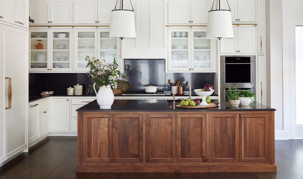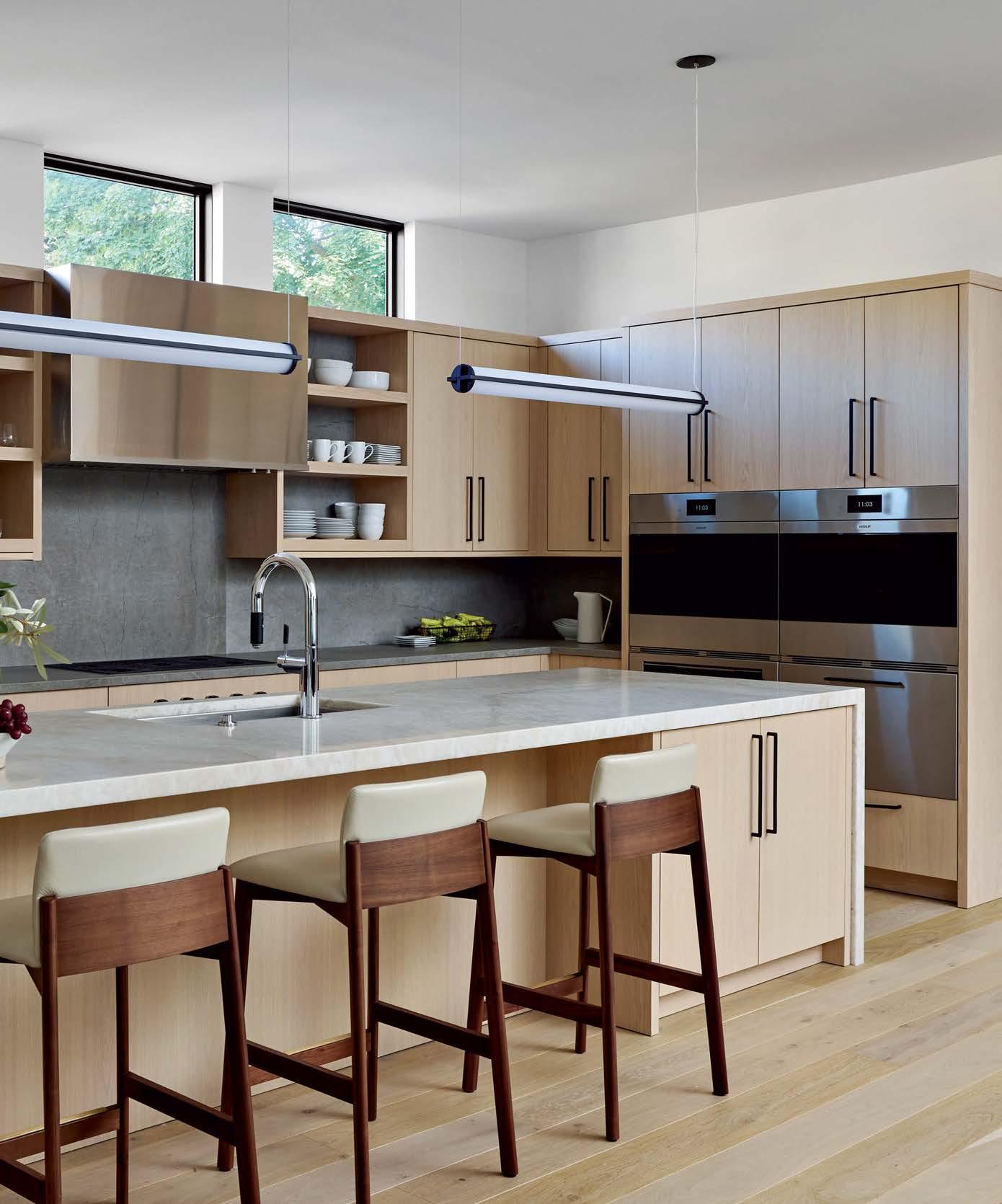 Within Reach counter stools pull up to the island, topped with quartzite from Terrazzo & Marble Supply Companies and lit by linear Juniper pendants. The ovens and cooktop are Wolf; the faucet is Dornbracht.