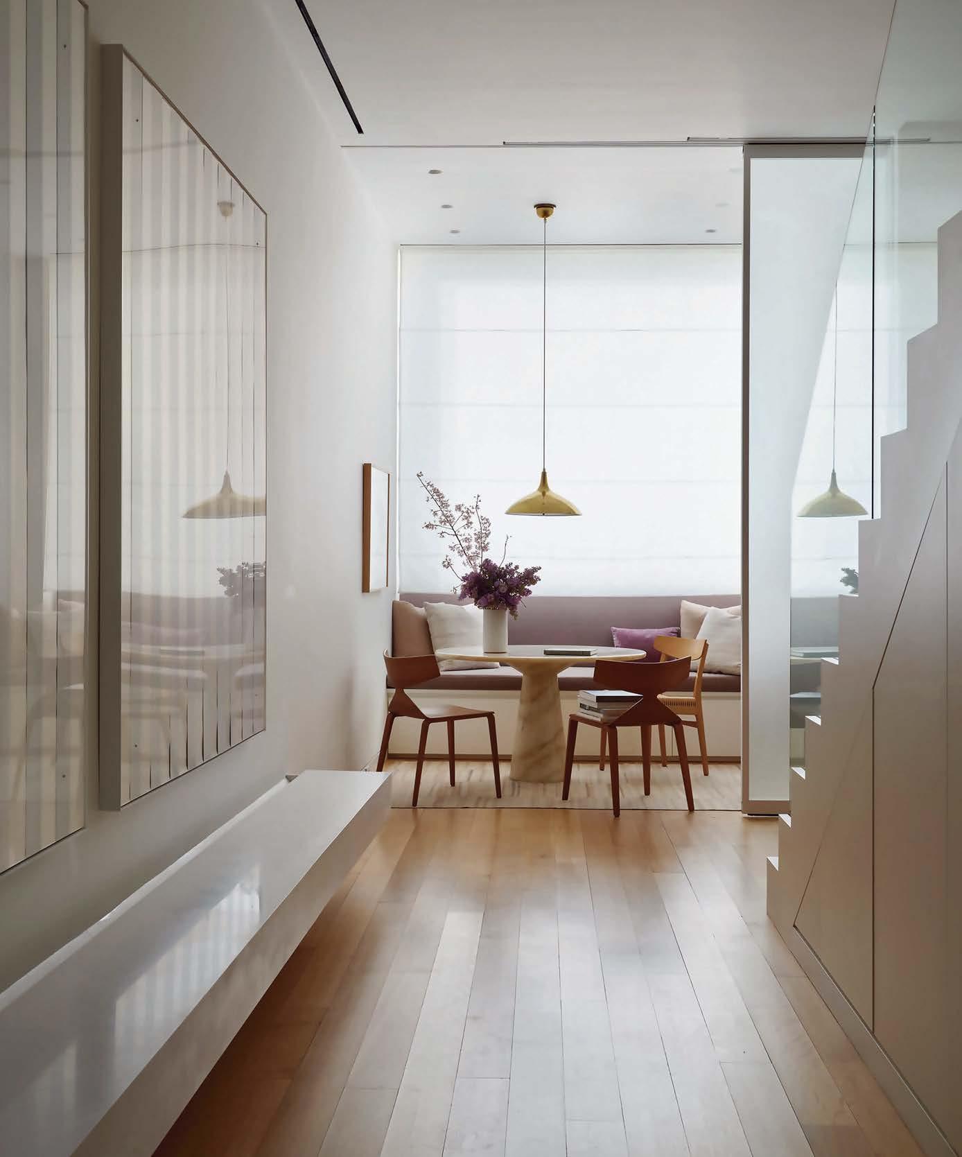 exposing the main living space to everyone who comes in,” Dufresne explains. On one side is the dwelling’s focal point—a dramatic central stair that rises Escher-like with treads that almost seem to float. Nearby, a window with frosted glass channels allows in sunlight during the day while offering a degree of opacity and privacy at night. General contractor William Bigane calls the stair installation the biggest challenge on the project. “We built it from top to bottom,” he says, noting it took six months to complete.