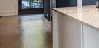 Left: Constructed of the same Iceberg Belissima quartzite that composes the counters, two sliding doors above the Wolf range conceal spice racks. Below, Shiir’s Primitive rug adds warmth and texture.