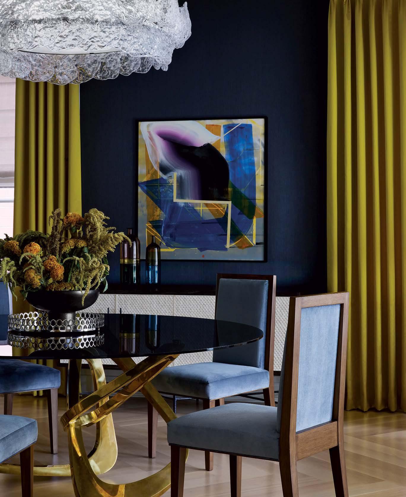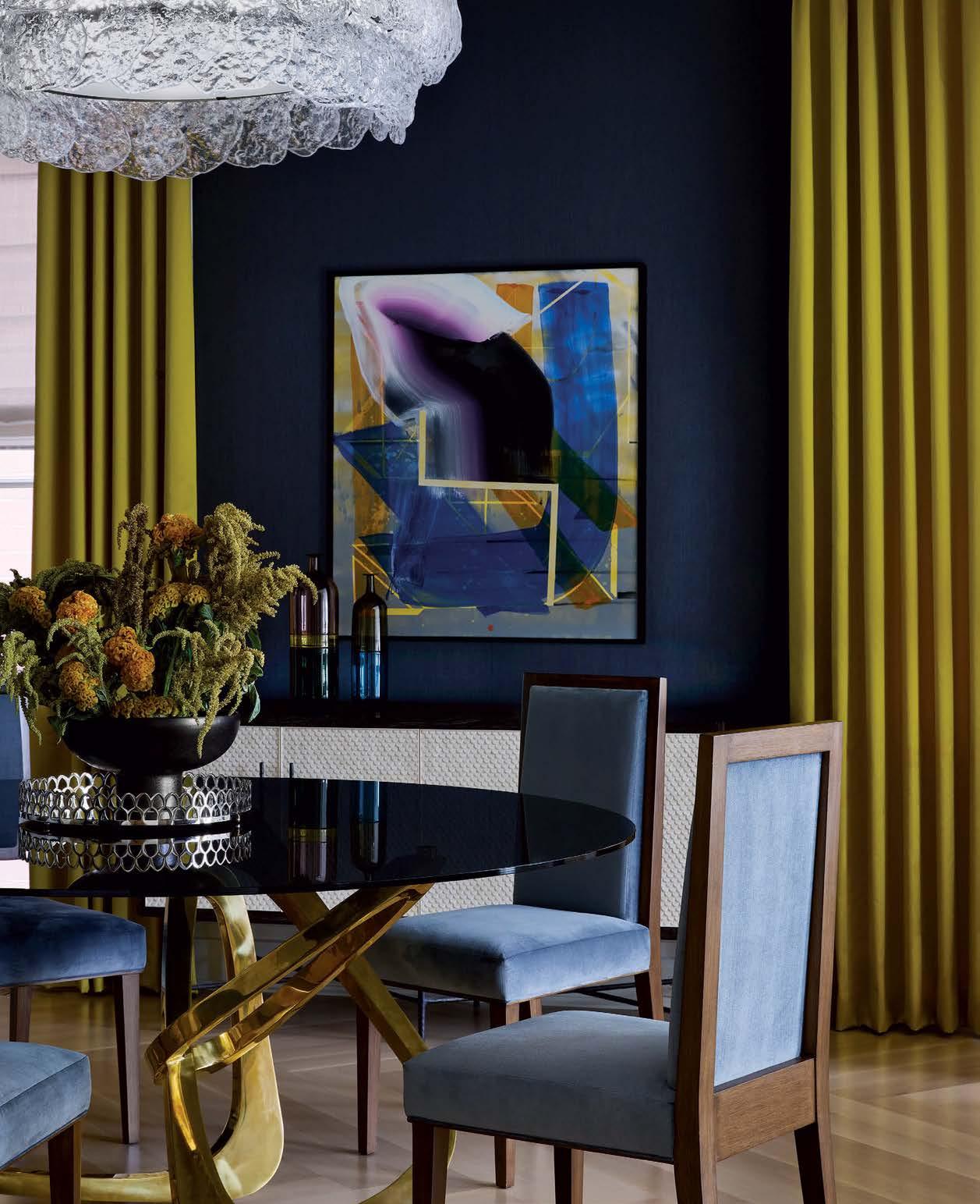 From the kitchen’s citrine leather stools to the family room’s emerald velvet armchair, a bold palette permeates the downstairs, infusing energy into the entertaining spaces. The dining room is so saturated in royal blues—seen on the wallcovering and chairs—that they almost act as a neutral. Threaded in golds, they tie into an