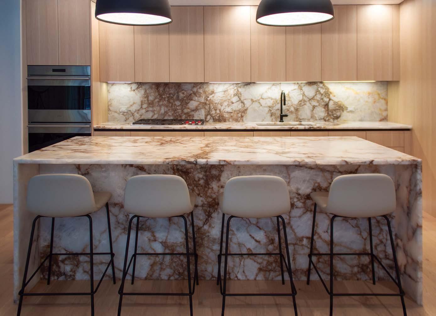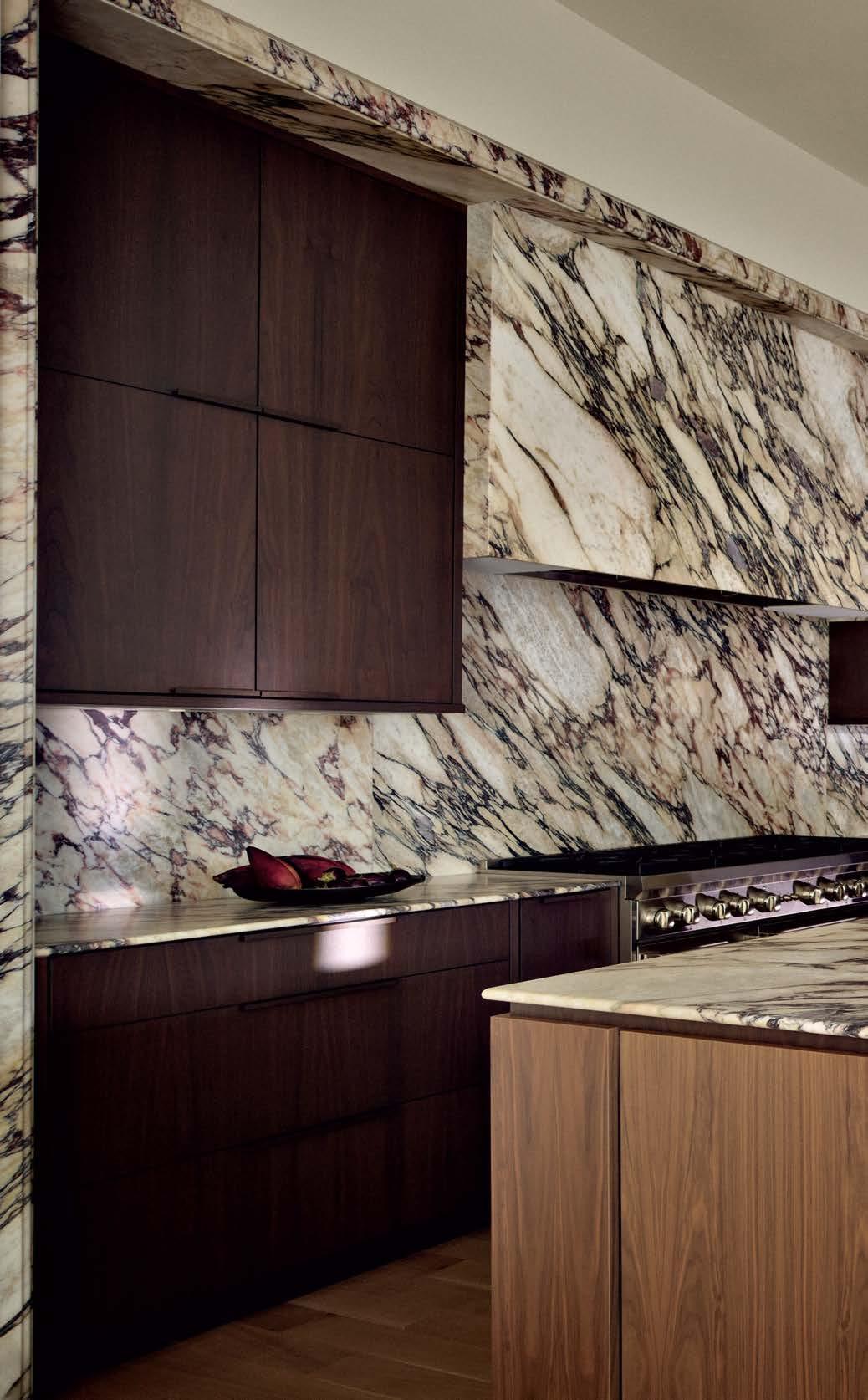 Bold Calacatta Viola marble from Terrazzo & Marble Supply Companies makes a statement in the kitchen. It’s joined by walnut cabinetry by Woodface in contrasting stains, Audo Copenhagen stools, Hollis+Morris pendants and a Wolf range.