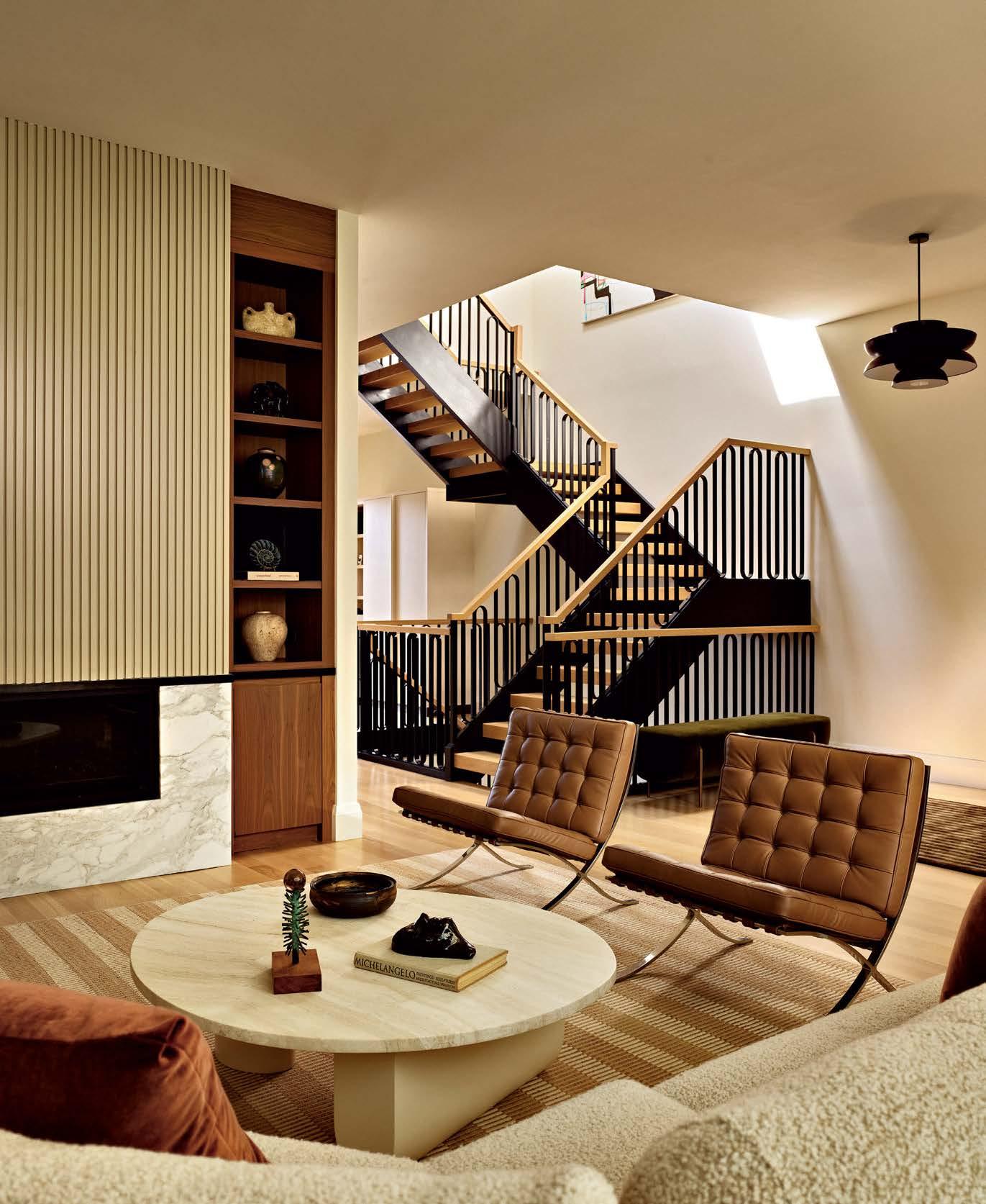 Vintage Knoll Barcelona chairs reupholstered with Edelman leather face a travertine-and-lacquer coffee table by Egg Collective in the living room. For the fireplace, designer Kate Taylor commissioned a bespoke plaster-and-marble surround.