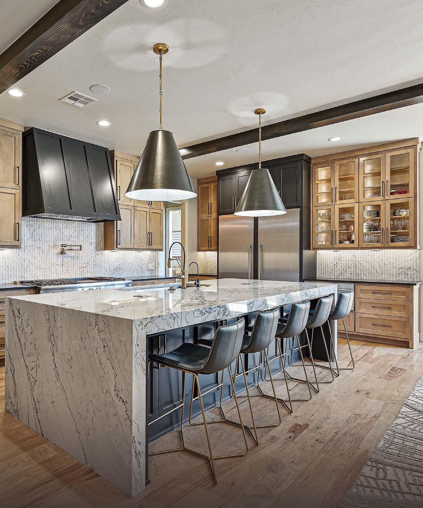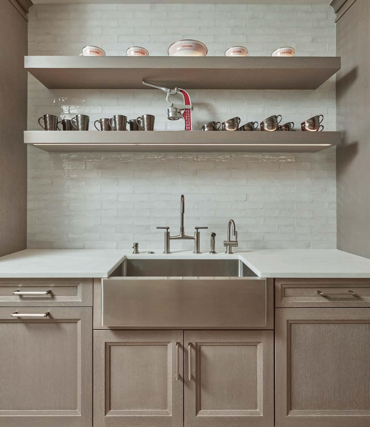 To give life to their vision of a dwelling that would be sophisticated and elegant yet sturdy enough to stand up to life with children and a dog, they brought on architect Kenneth Brinkman, general contractor Aaron Lhotka and interior designer Kate Taylor. “Comfort and durability were two driving factors in the design, because this is a family home,” Taylor says. “But the owners have great taste and are drawn to interesting pieces of furniture and beautiful finishes, so that kept things exciting.”