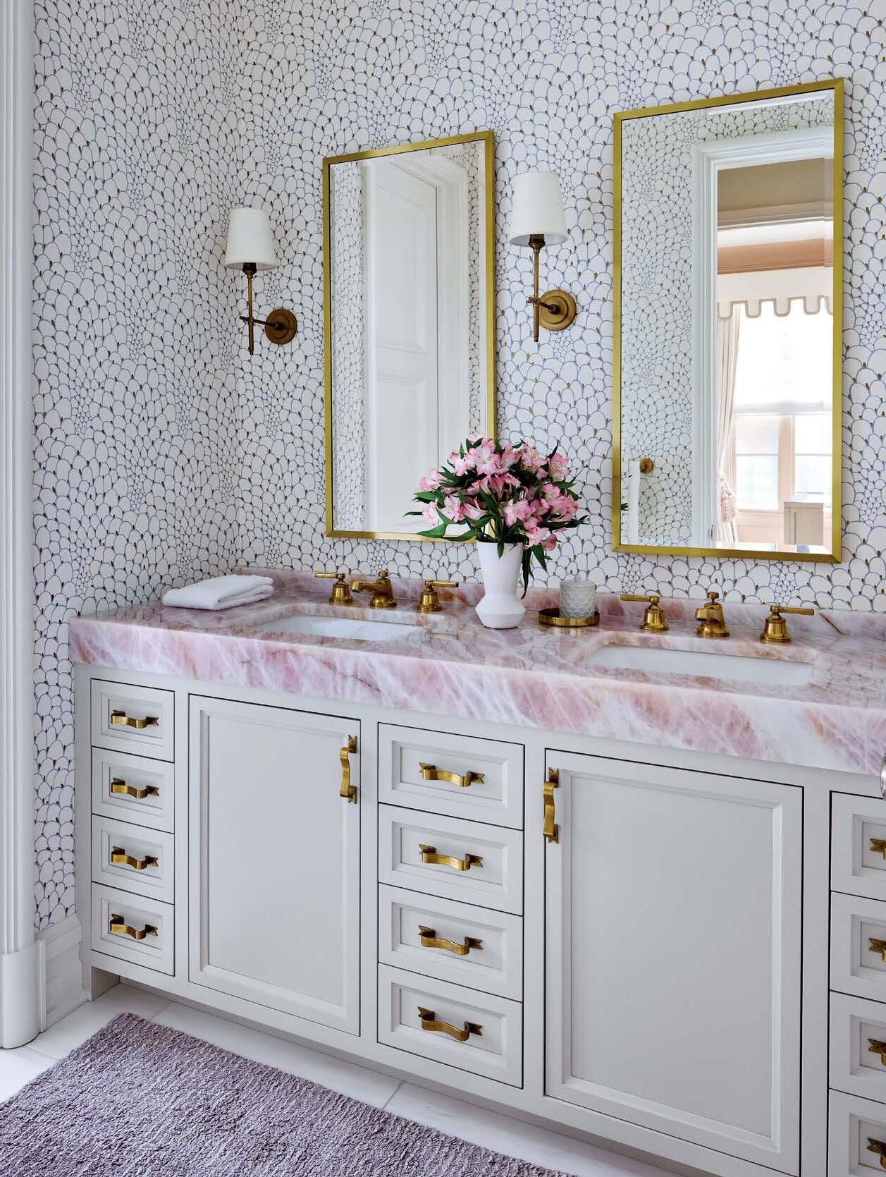 Against a Relativity Textiles wallcovering, Visual Comfort & Co. sconces join Pottery Barn mirrors in the daughter’s bathroom. Beata Heuman handles decorate cabinetry by Intelligent Spaces by Design LLC underneath Iceberg Magenta quartzite countertops.