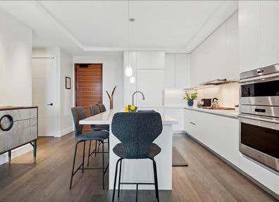 Oak and Opal Marquette quartz feature on the Bulthaup kitchen’s island, complete with Holly Hunt stools and a Studio Van den Akker chandelier. A bespoke banquette and table incorporate Joss & Main chairs and a Shades of Light pendant. The sectional is A.Rudin.
