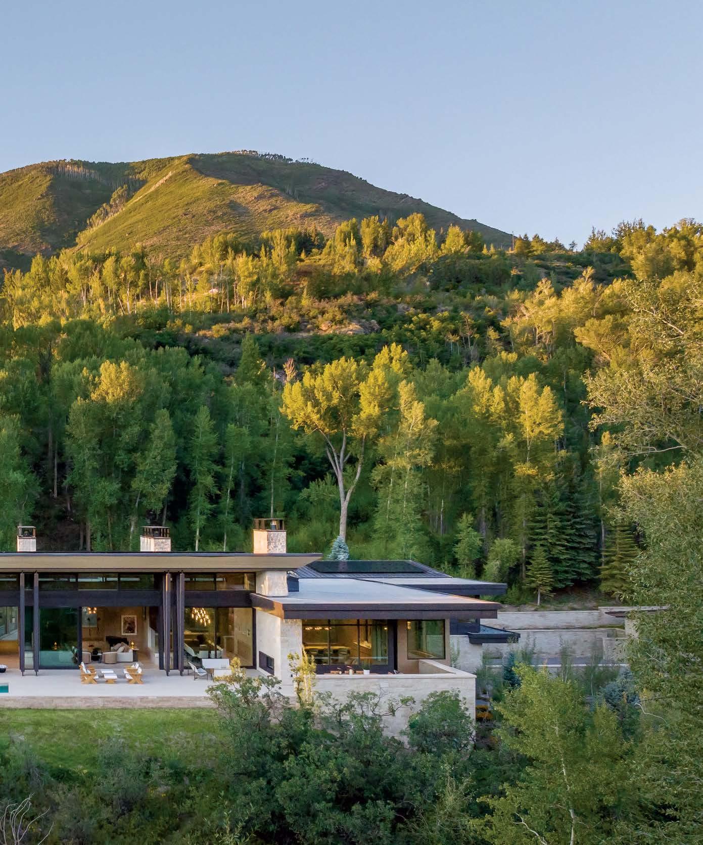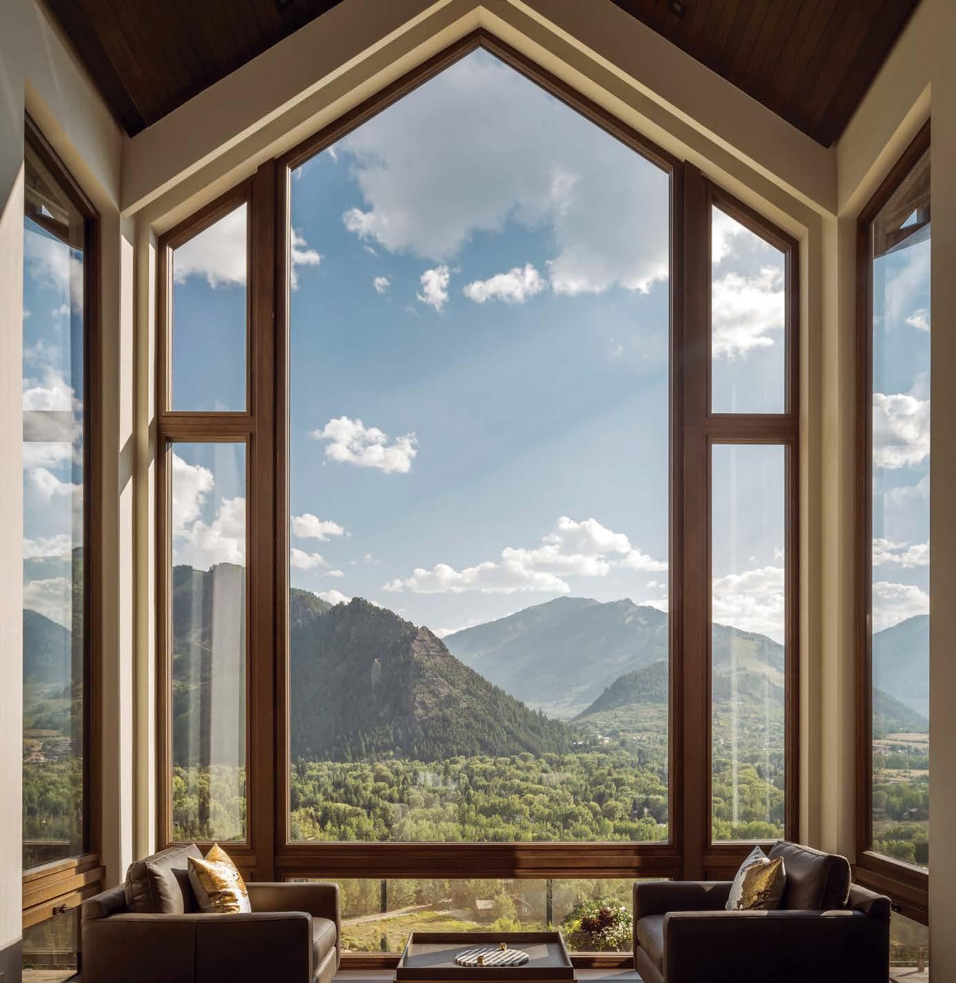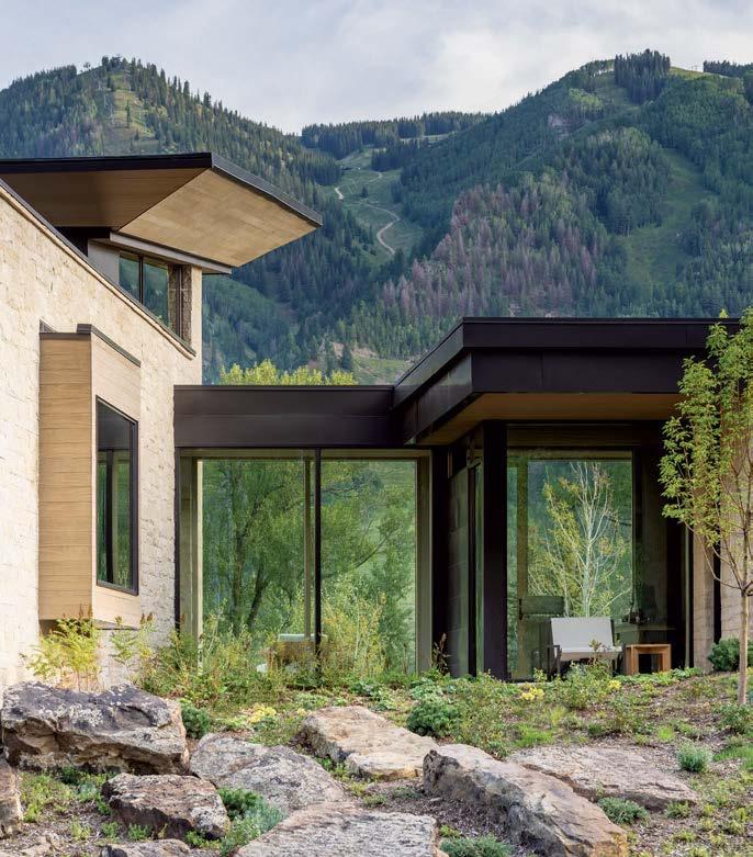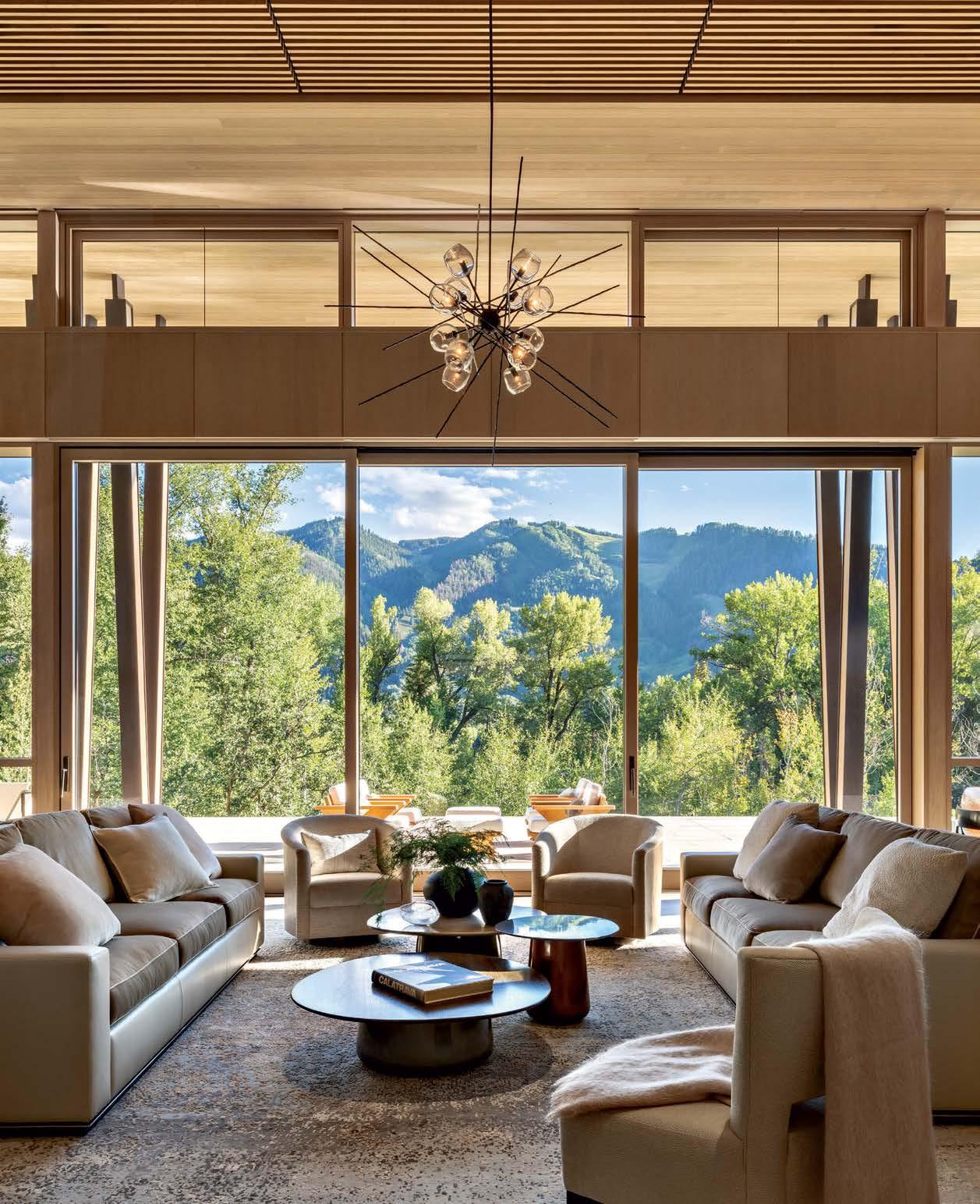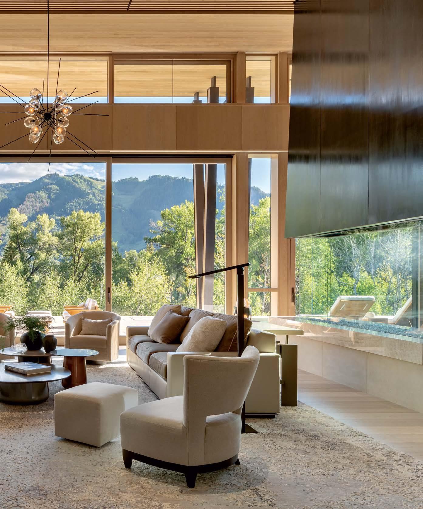 ON THE COVER: Aspen Mountain views are framed by the great room’s wall of glass, courtesy of Quantum Windows & Doors, in a multigenerational getaway designed by architect Charles Cunniffe alongside project manager Erica Delak and interior designer Courtney Nystrom. Club chairs, a set of sofas and an accent chair and ottoman, all A.Rudin, provide ample seating around Holly Hunt tables. A Hubbardton Forge pendant stars as the space’s exclamation point. Page 162