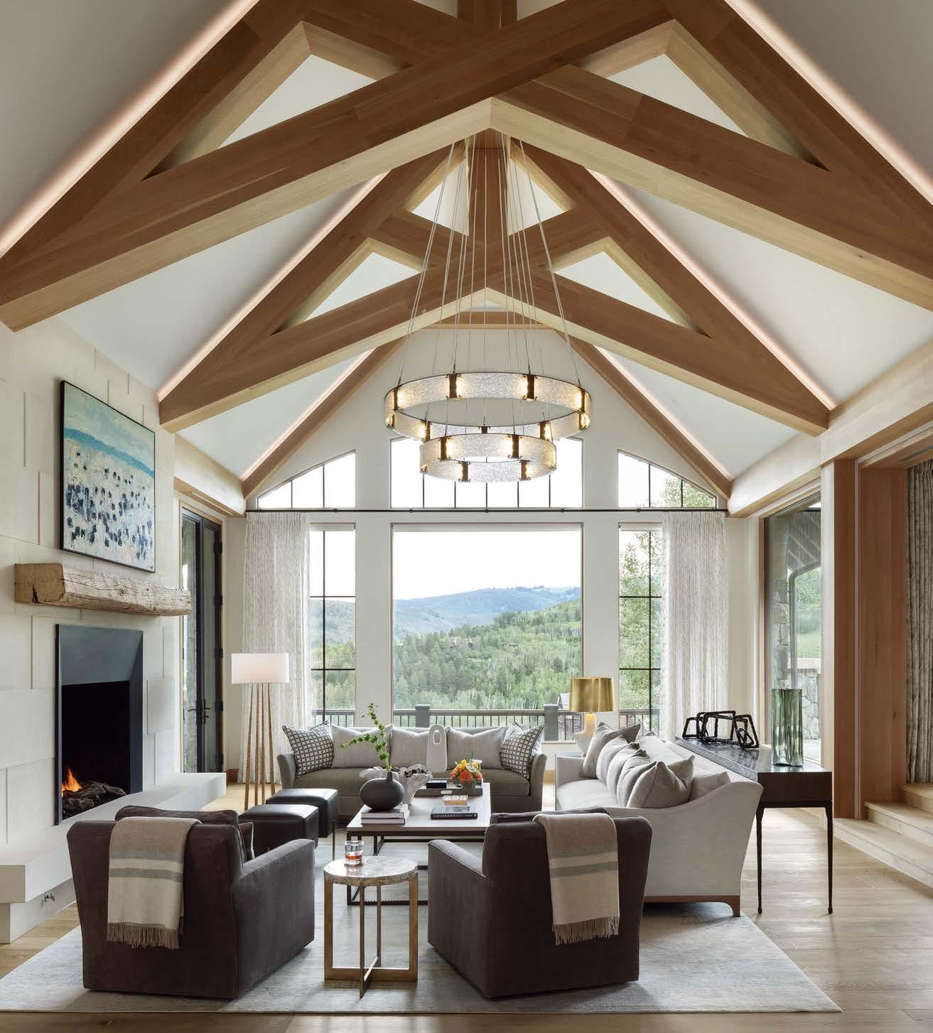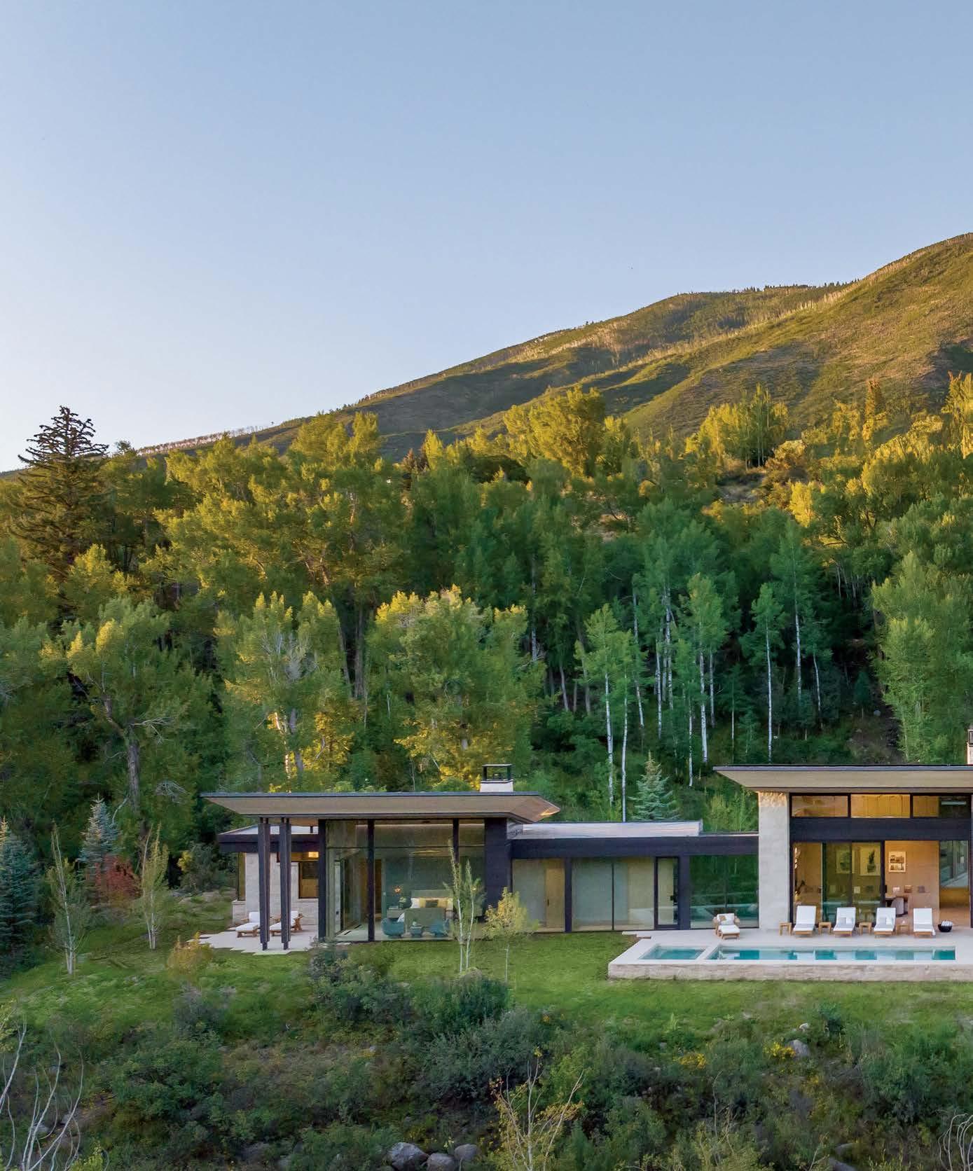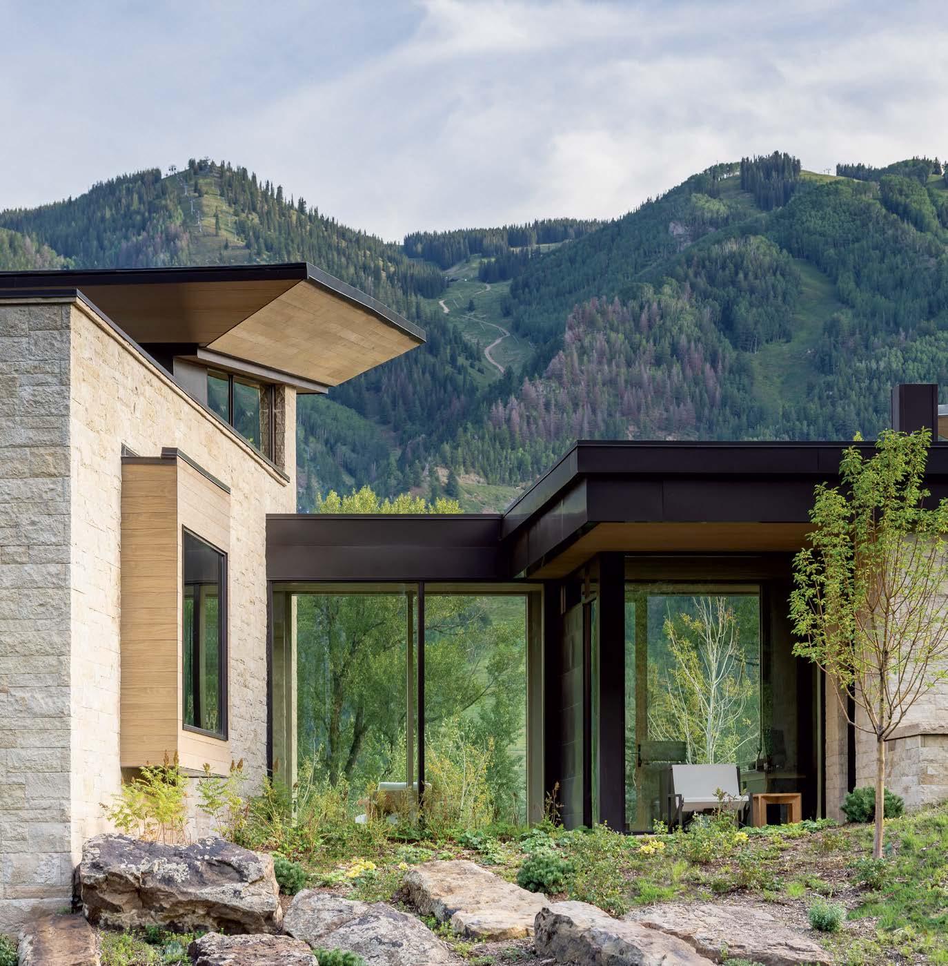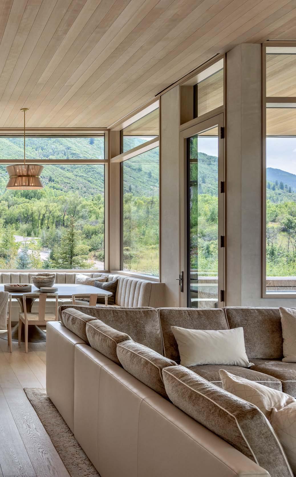 ON THE COVER: Aspen Mountain views are framed by the great room’s wall of glass, courtesy of Quantum Windows & Doors, in a multigenerational getaway designed by architect Charles Cunniffe alongside project manager Erica Delak and interior designer Courtney Nystrom. Club chairs, a set of sofas and an accent chair and ottoman, all A.Rudin, provide ample seating around Holly Hunt tables. A Hubbardton Forge pendant stars as the space’s exclamation point. Page 162