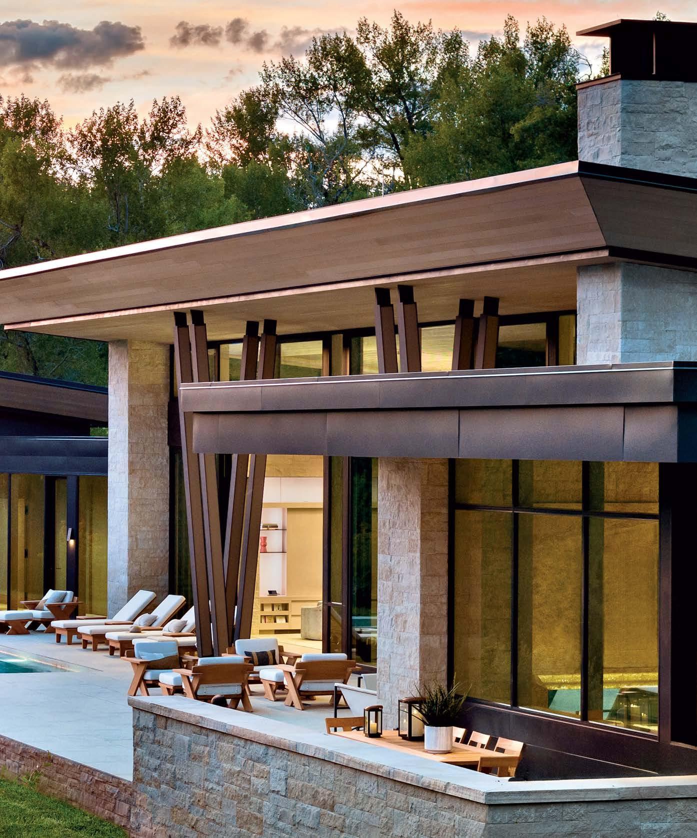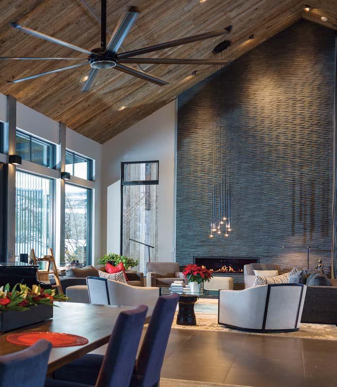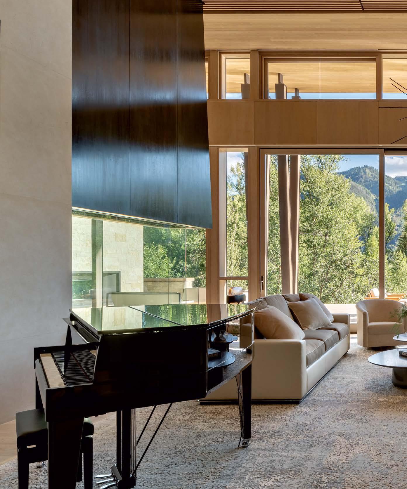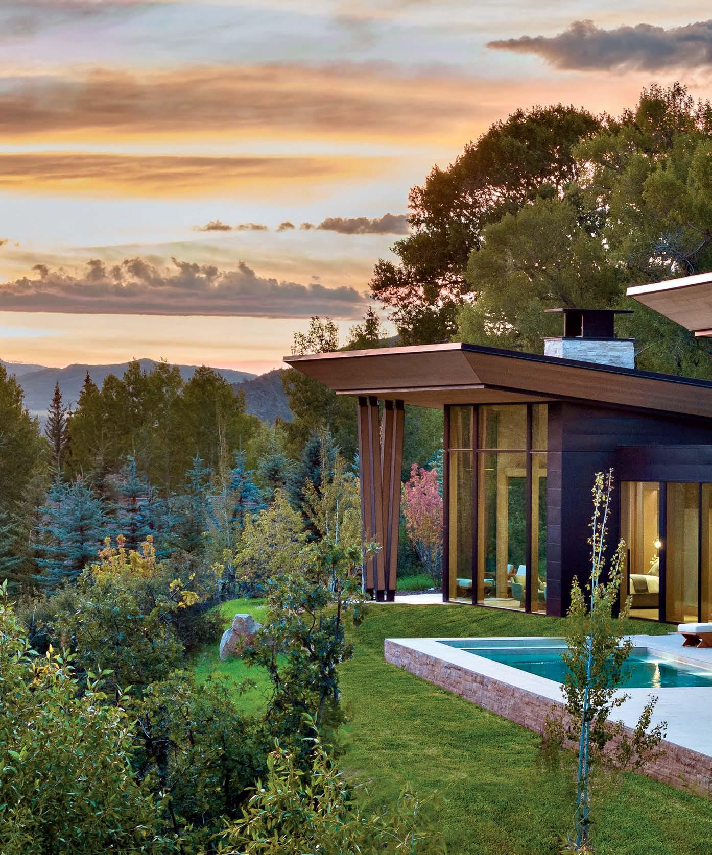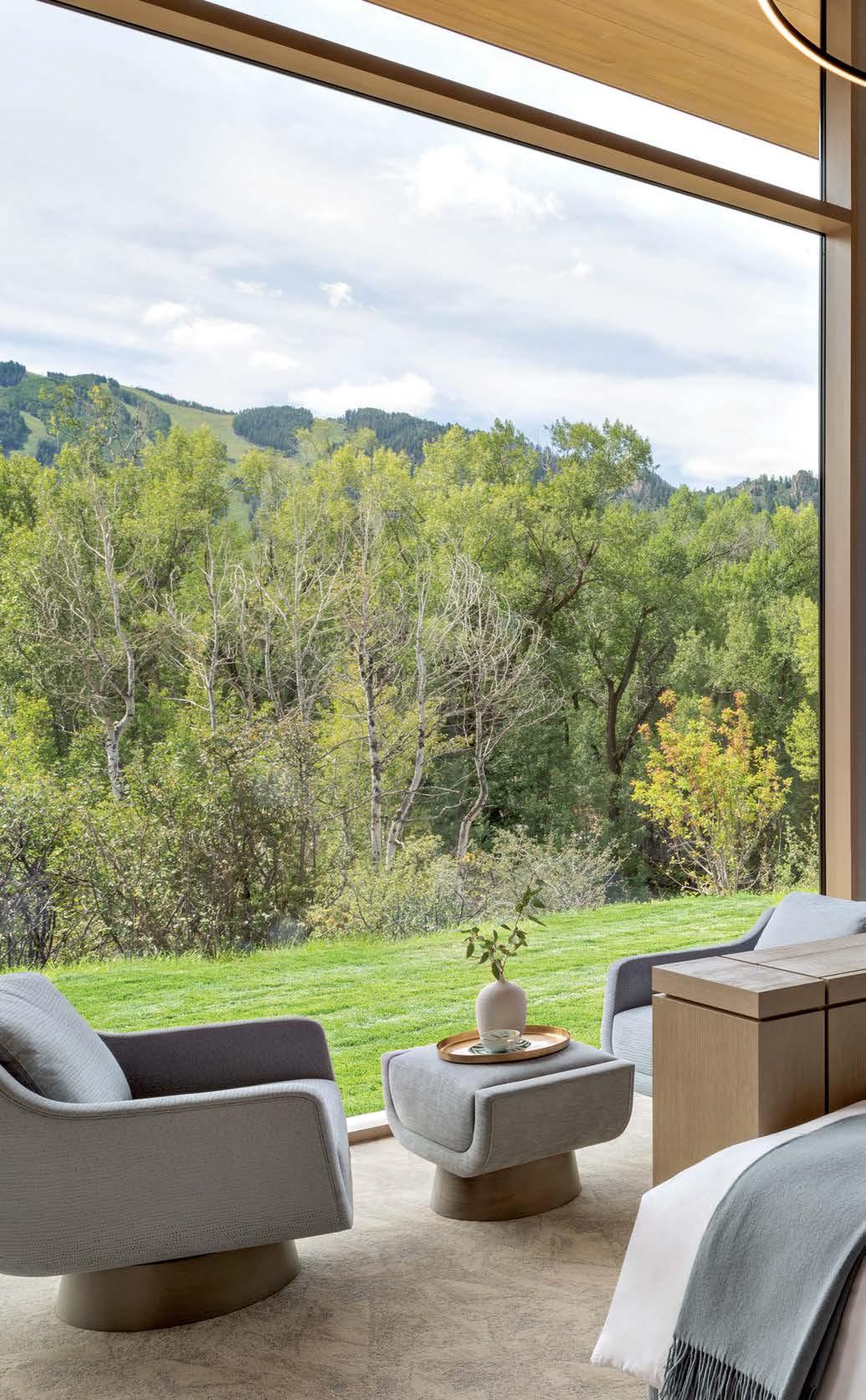 ON THE COVER: Aspen Mountain views are framed by the great room’s wall of glass, courtesy of Quantum Windows & Doors, in a multigenerational getaway designed by architect Charles Cunniffe alongside project manager Erica Delak and interior designer Courtney Nystrom. Club chairs, a set of sofas and an accent chair and ottoman, all A.Rudin, provide ample seating around Holly Hunt tables. A Hubbardton Forge pendant stars as the space’s exclamation point. Page 162