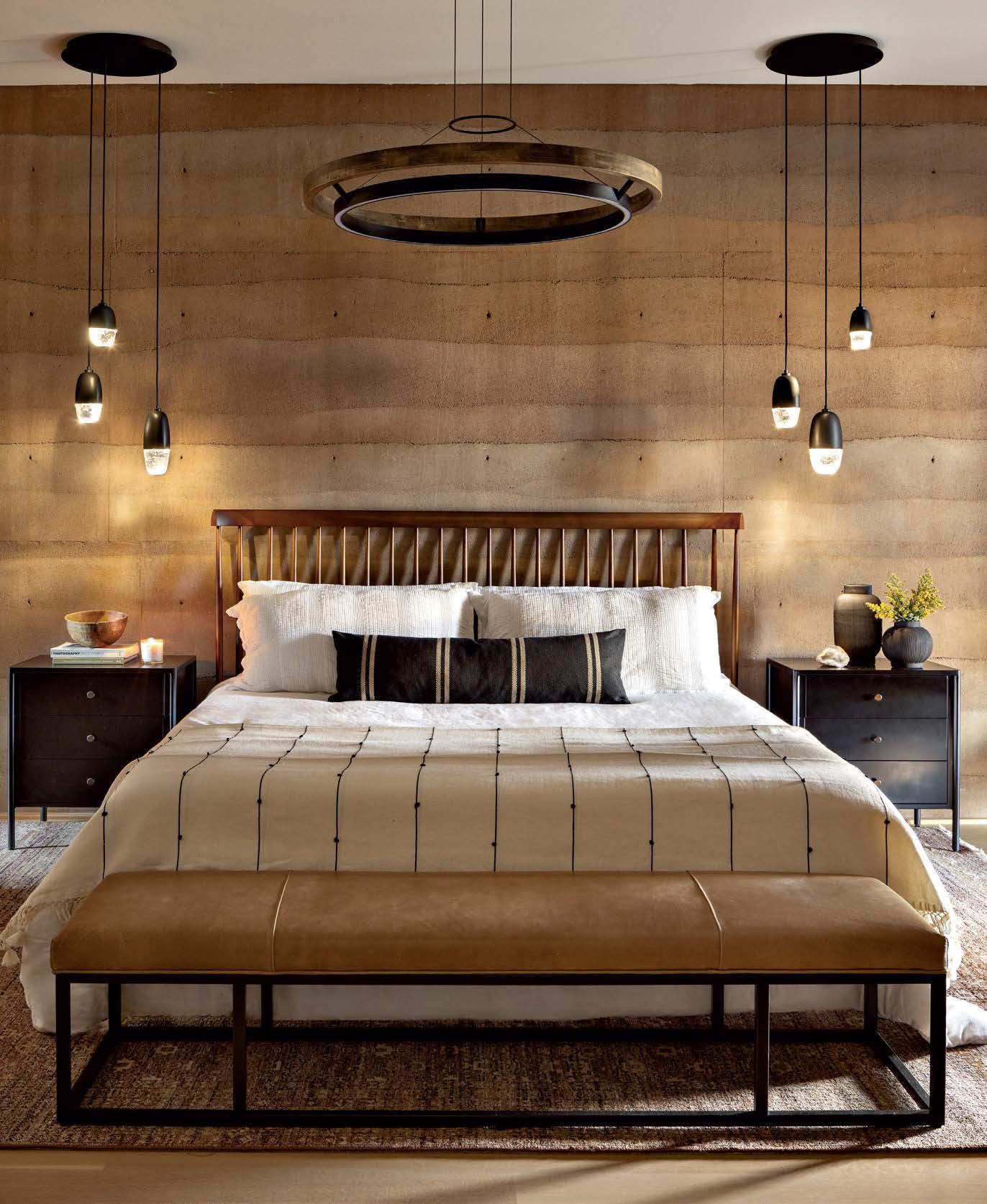 Opposite: Contrast enlivens a guest bedroom, where the rammed-earth wall’s wave pattern is set off by Hammerton Studio pendants and a Visual Comfort & Co. chandelier. The Nuevo bed wears a La’Xha blanket. The bench and nightstands are Four Hands.
