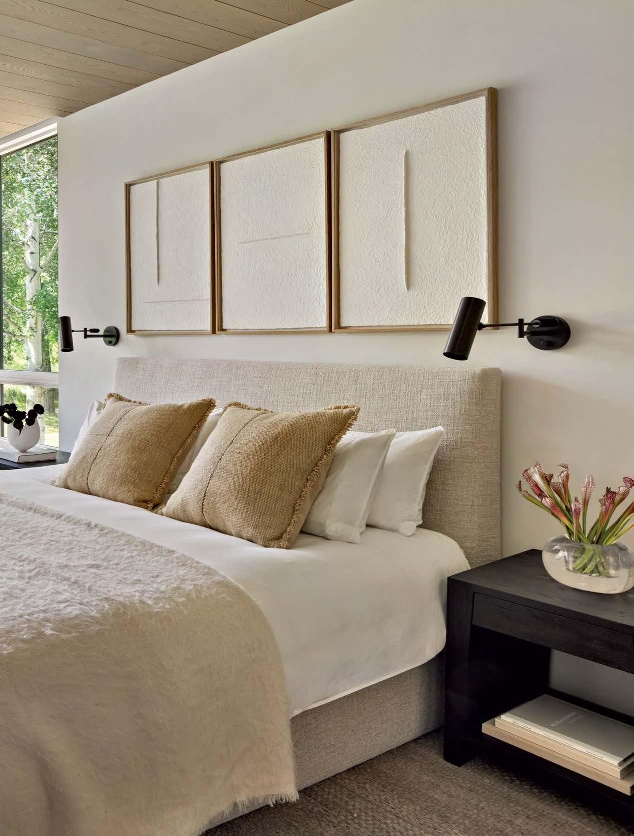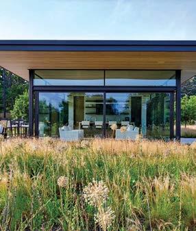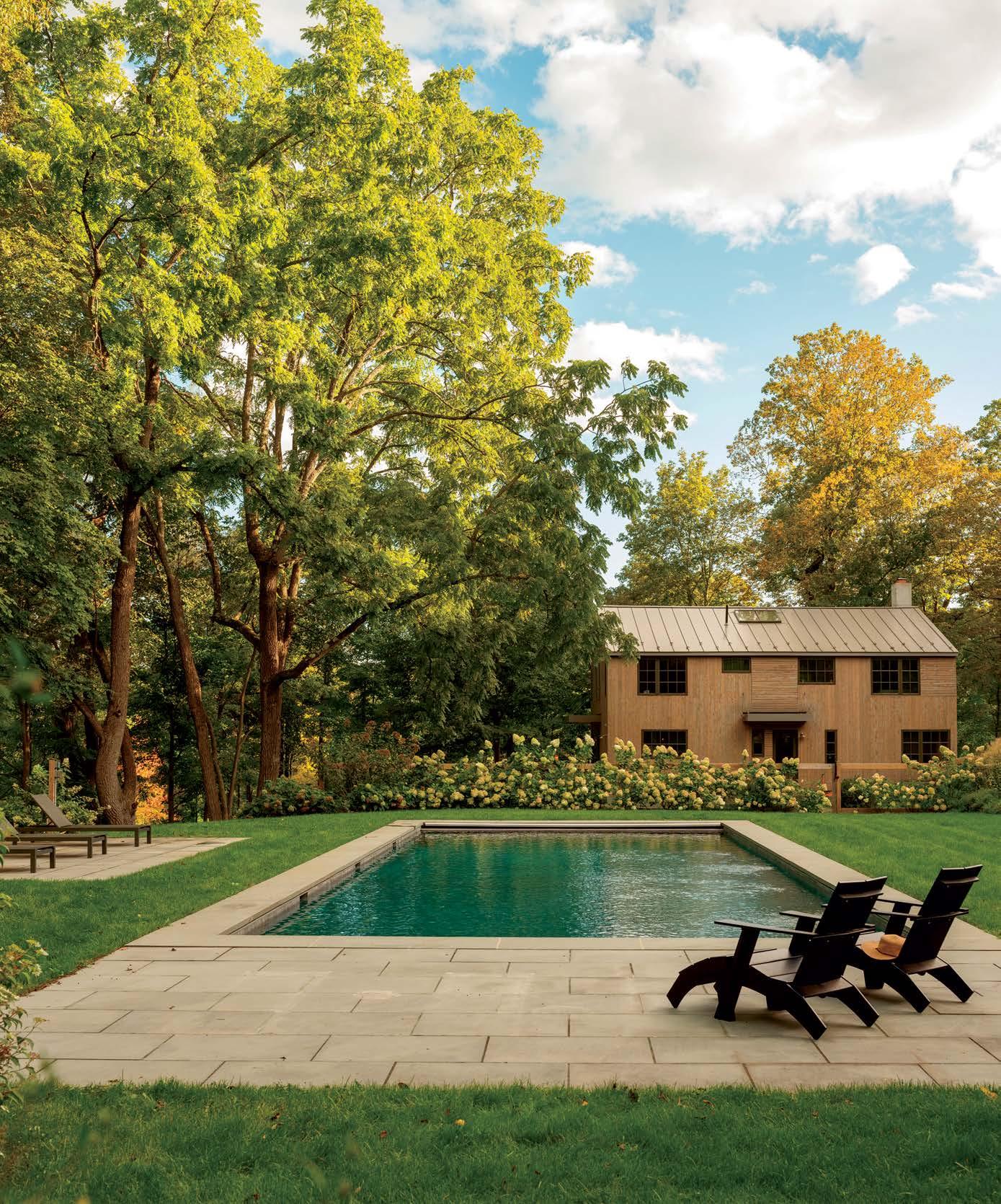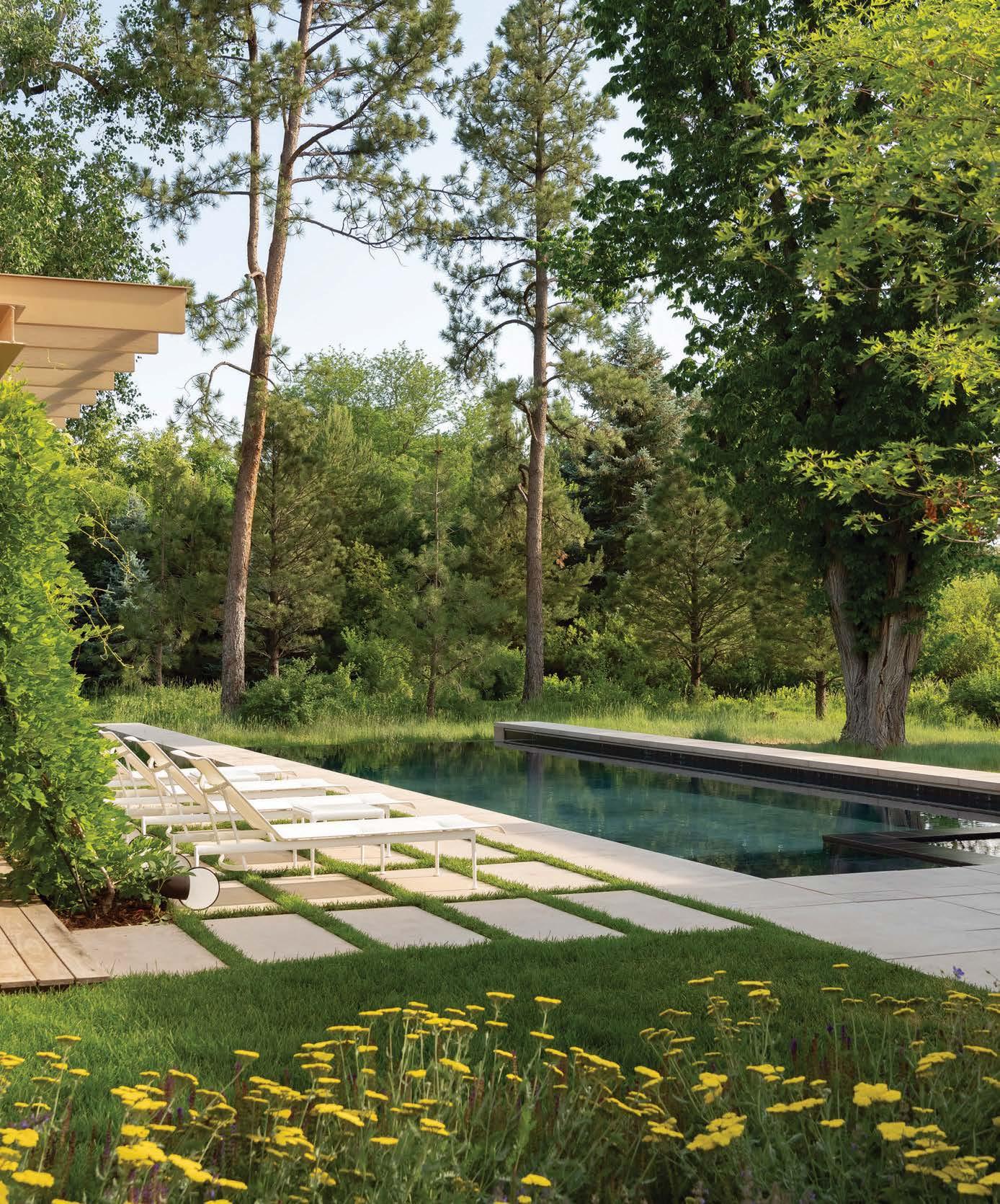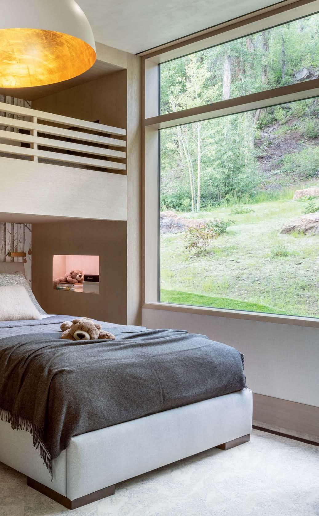 At the far end of the main wing lies the owners’ suite, “imagined as a bright, private retreat,” Delak continues, with dual bathrooms and closets as well as an office space. The guest wing’s bedrooms echo the main wing’s restfulness, offset by a playful bunk room for the family’s younger members that features forestthemed wallpaper and is adjacent to a lounge leading to the lawn. There, landscape architect Jason Jaynes’ plant palette embraces seasonal color shifts, while meandering walkways offer a meditative experience across the acreage.