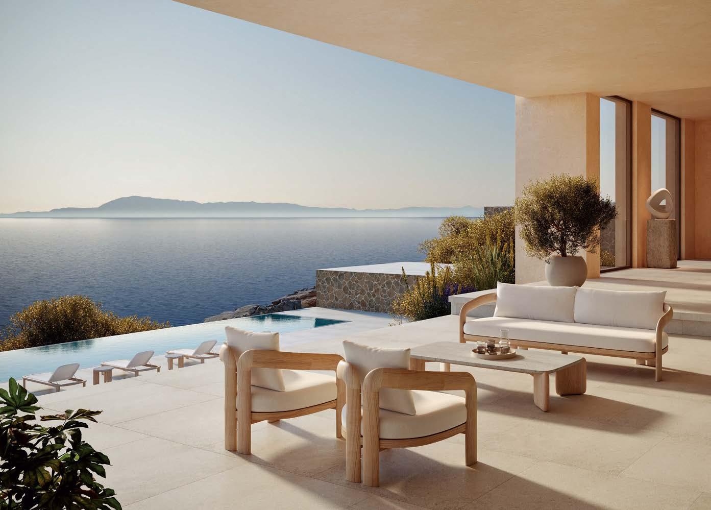 Teak furnishings from Summit were selected for the terrace. A section of the tiled deck surface is adroitly engineered to convert to an adjustable pool-and-spa— a custom feature designed with Twinscape.