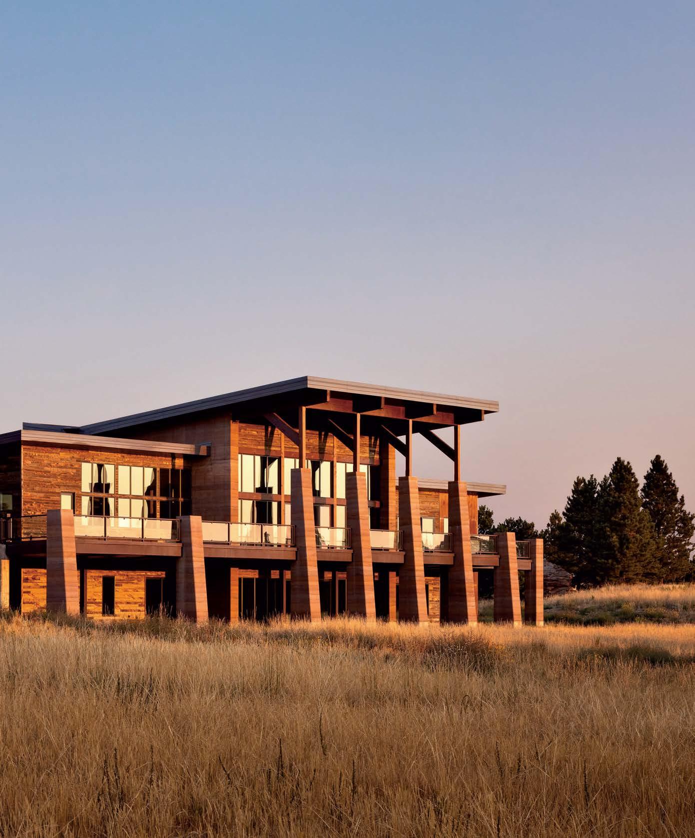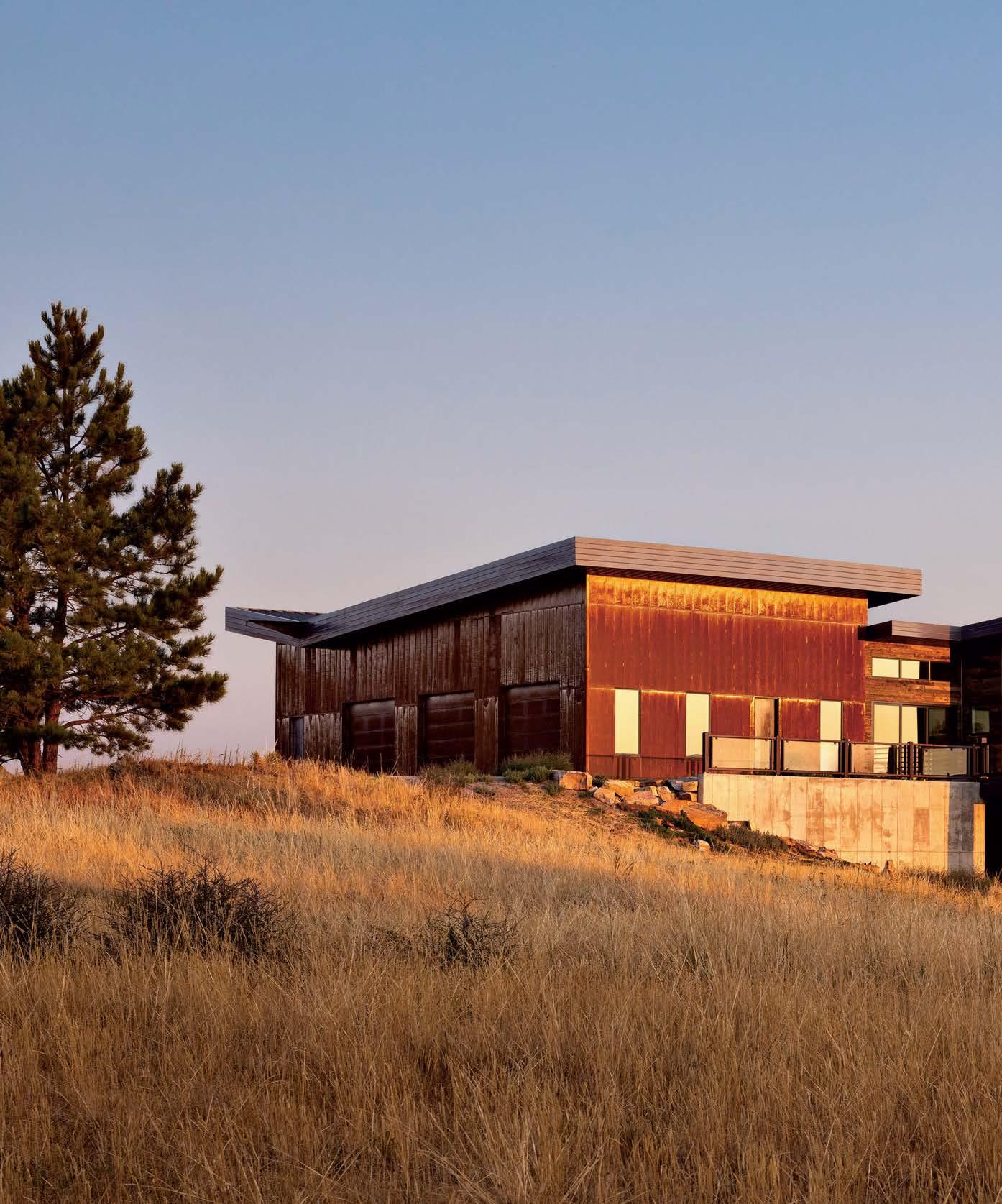Previous page: An exterior of oxidized Corten steel, reclaimedwood siding and rammed-earth columns by Sirewall USA, the firm behind all of the residence’s rammed-earth features, nod to the landscape’s colors. Pella windows line the rear façade.