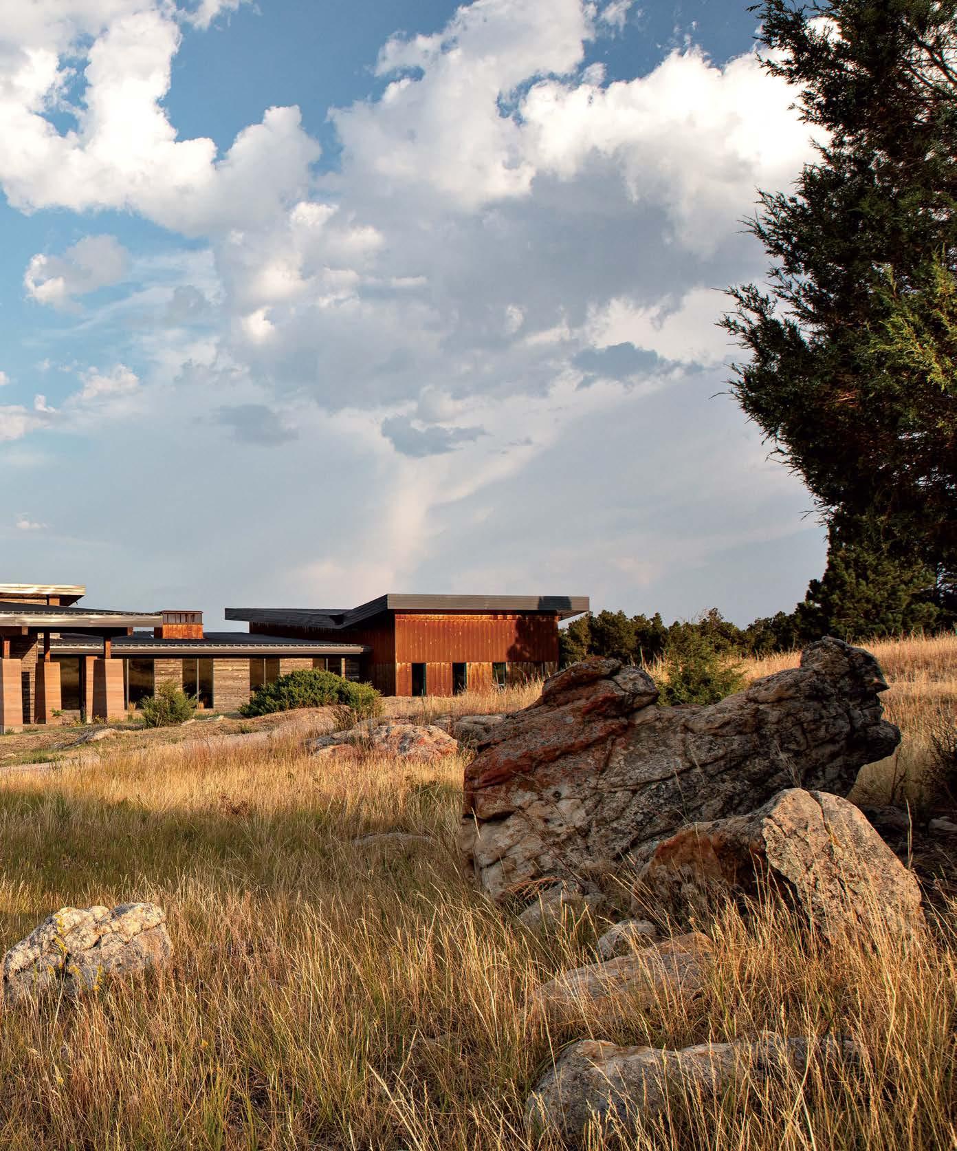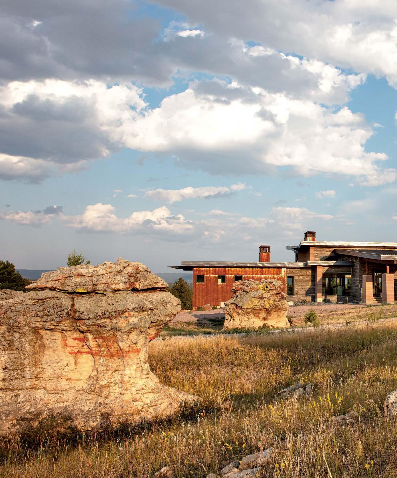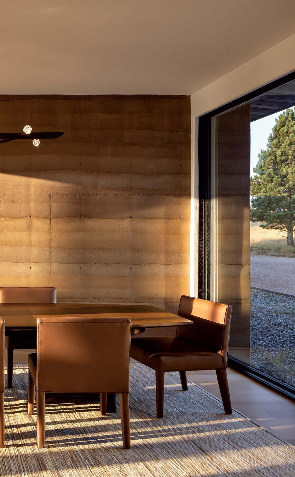 Alove of land, stone and the earth itself hard-launched the vision for this retreat in northeastern Wyoming graced with long-range views of the Black Hills mountains. The site’s statuesque sandstone outcroppings—rock formed in the early-to-mid Cretaceous period—were a particular draw for the homeowners, a couple with backgrounds in geology. These sculptural stone formations ultimately helped dictate where the residence would be sited, says landscape architect Charlie Kees, noting how the driveway is designed to wind through them. In turn, the rugged surroundings inspired the residence’s weighty architectural material palette, which stars two rammed-earth walls that bisect the house and serve as subtly dramatic backdrops across two levels. “They’re like an extrusion of the earth rising up out of the ground,” describes architect Brandon Daigle of the dwelling’s standout features. “They’re monolithic and massive. It really speaks to our clients’ interests that we built their home—this modern rustic ranch that blends contemporary and western design features—around these two structures.”