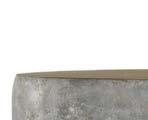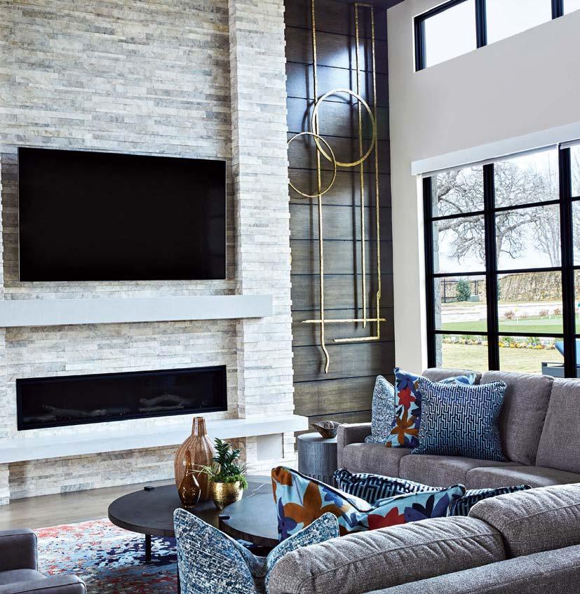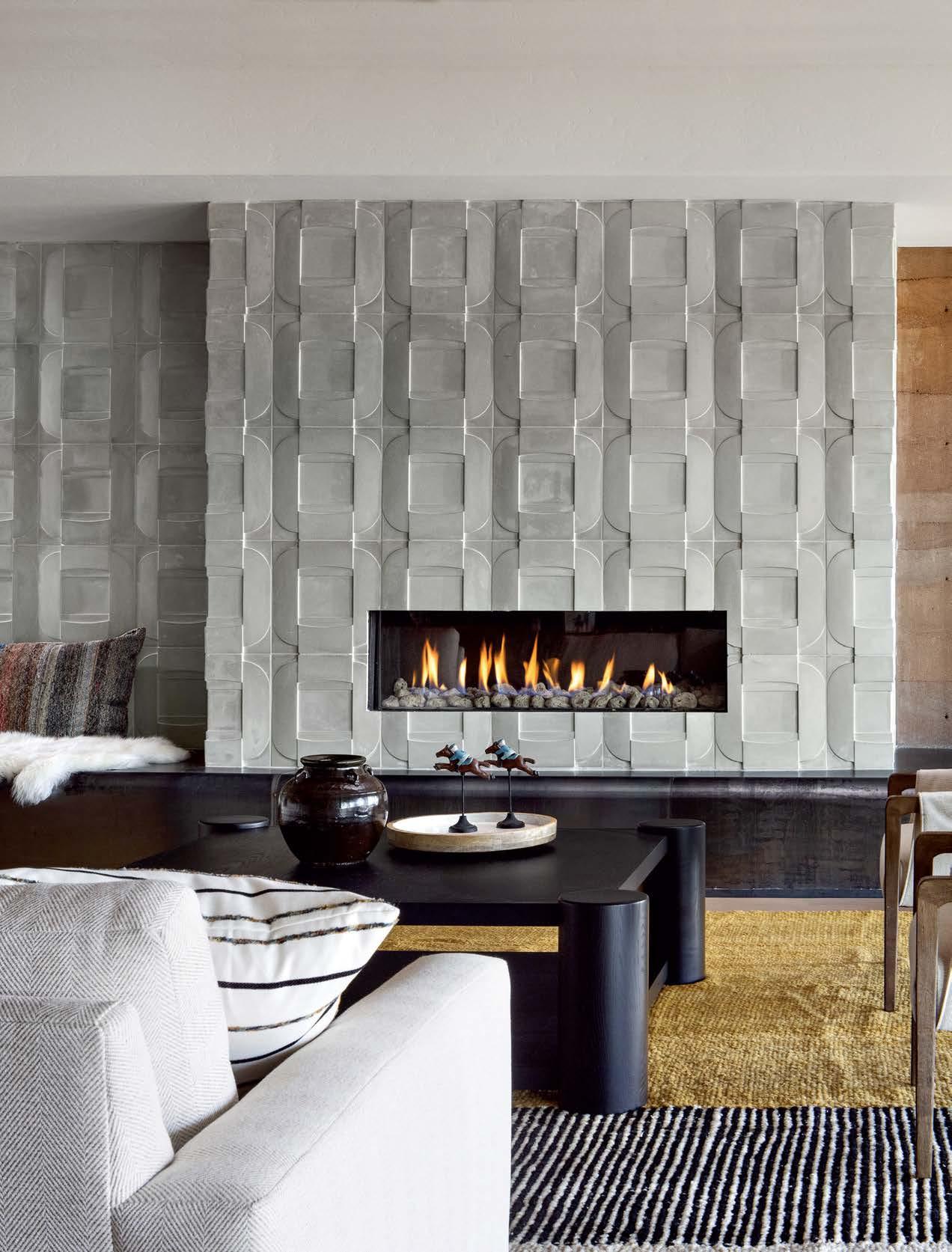 Textural Arto concrete cladding lines the family room’s fireplace surround. Four Hands chairs and a Rowe Furniture sectional flank a Dowel coffee table atop a Pampa rug; the corner accent chair is Lee Industries. Ben Steele art adds a lighthearted touch.