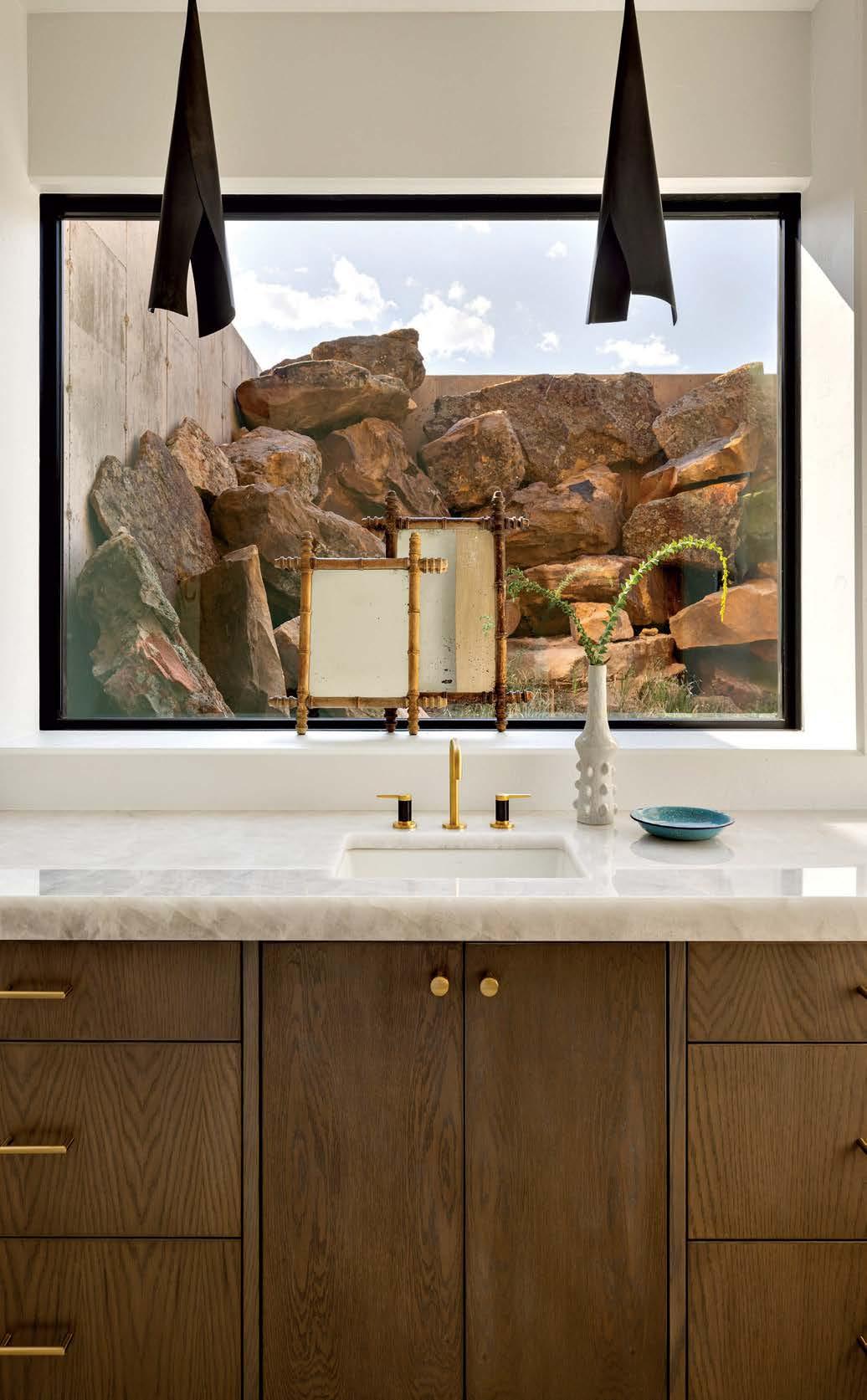 Right: Boulders tumble against a foundational wall, framed by a guest bathroom window, while Kelly Wearstler for Visual Comfort & Co. pendants meld with the view. Polished quartzite from Artistic Tile and a California Faucets fixture top William Ohs cabinetry.