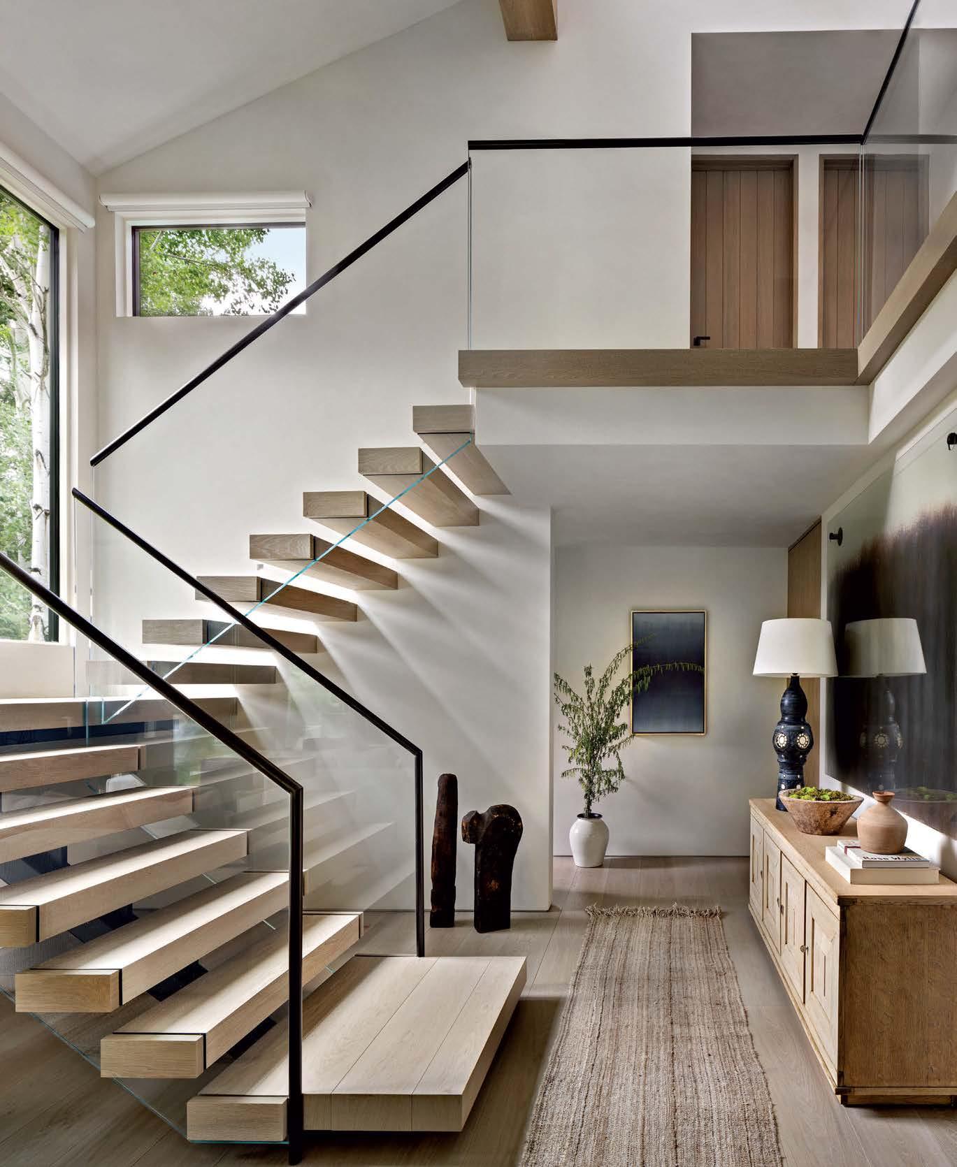 Floating treads lined by rolled-steel-and-glass railings define the entryway stair. Gregory Nangle art hangs above a vintage French buffet topped with a Georges Pelletier lamp. On the far wall is work by Eric Freeman, while antique Japanese fertility sculptures rest on the floor.