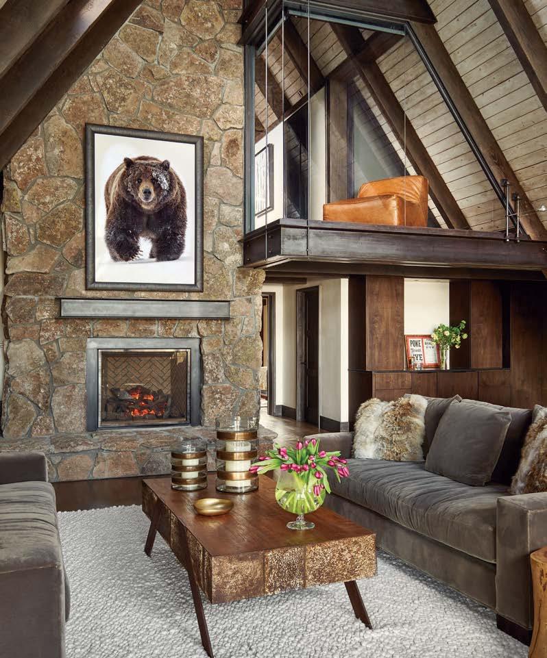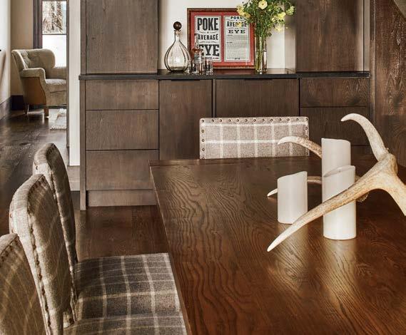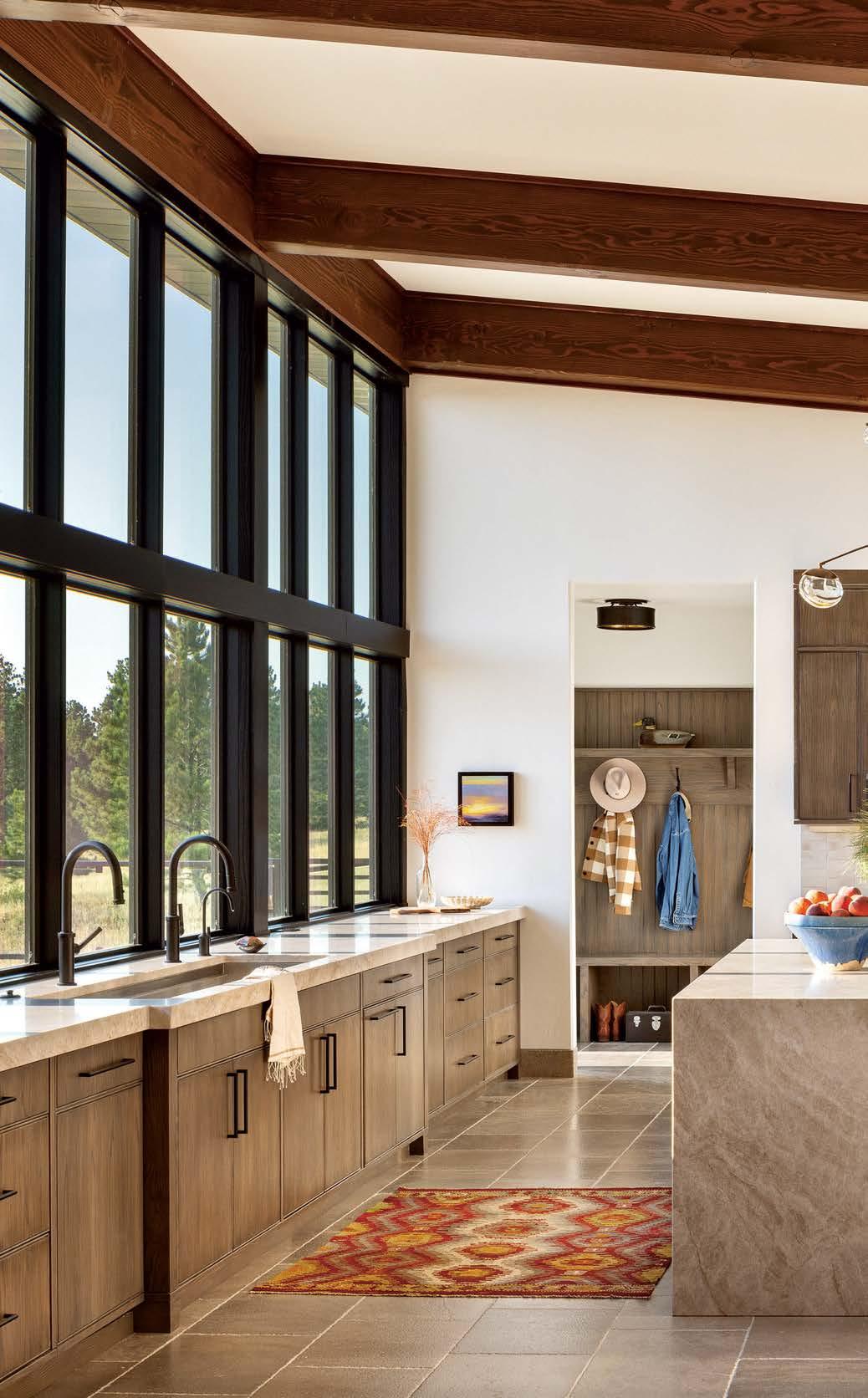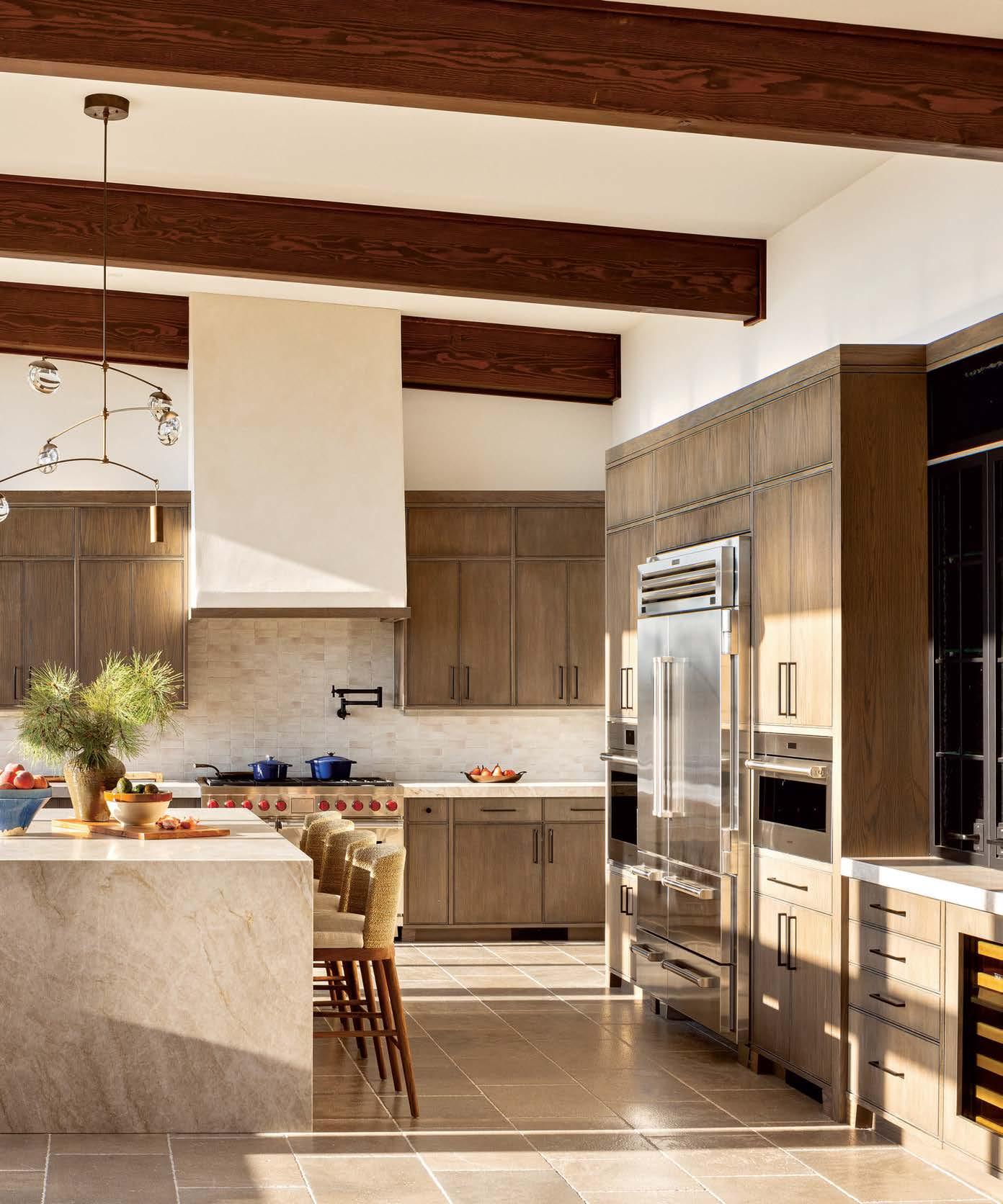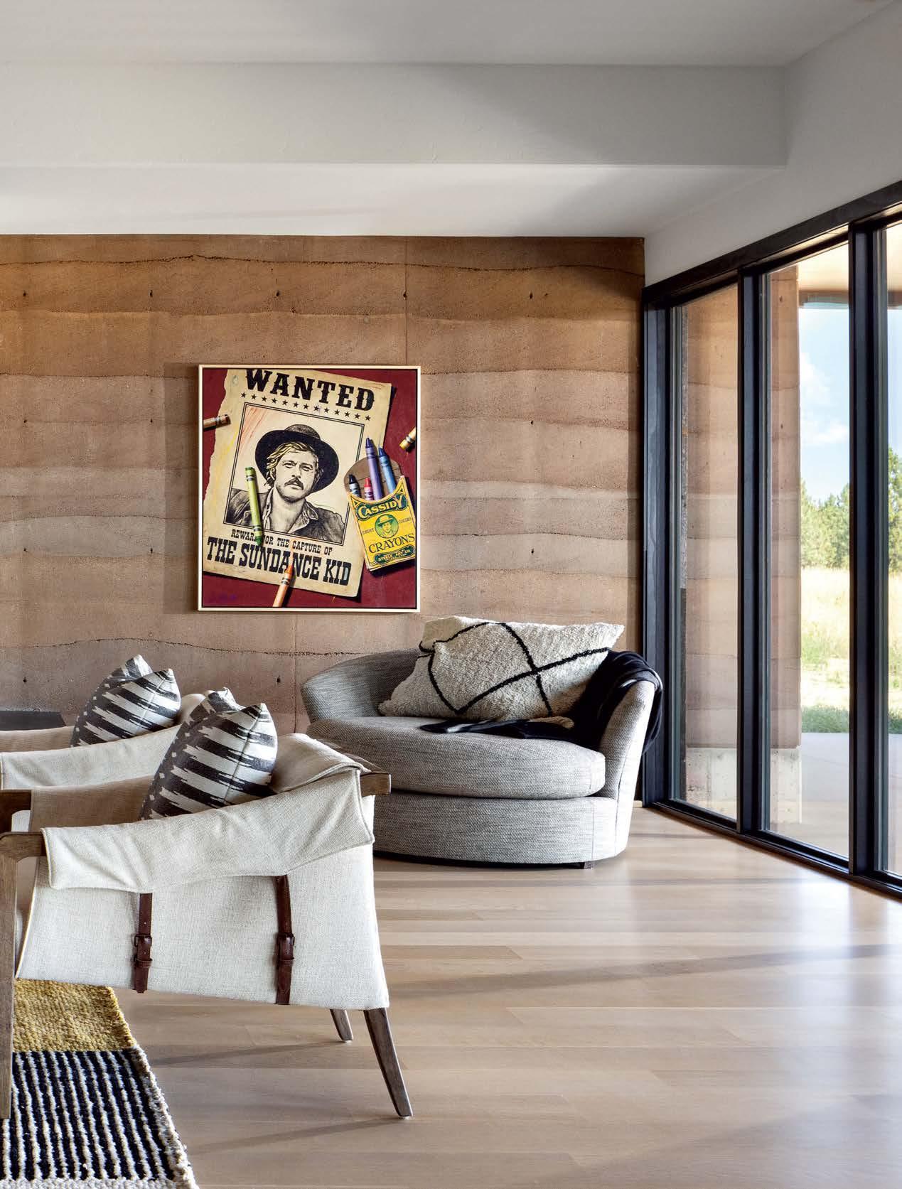 tan and almost to a chocolate brown, and look very much like earth strata.” To allow the natural gradient of colors to shine, Griffith complemented them with other warm neutral finishes, like the white oak flooring chosen for the common areas and the aged limestone of the kitchen. She selected a different stone tile in each of the home’s 11 bathrooms, but maintained the same cabinetry throughout the home for continuity. Otherwise, the designer cultivated an elevated yet relaxed environment that brings together a range of tactile textures: See the chic Venetian plaster of the great room’s fireplace and the kitchen’s hood; the interlocking pattern of the concrete tile on the downstairs family room’s hearth; the grass-cloth wallcovering incorporated into various bedroom walls. Furnishings follow suit, with substantial fabrics like leather featuring on key pieces in the great room, dining room and family room, while buckle details nod to a frontier spirit. Art, too, ties into the home’s sense of place. Griffith visited galleries in Jackson and Scottsdale, Arizona, with the wife early in the process (“We had so much fun choosing pieces together,” she enthuses), their selections ultimately helping to direct the feel of each room. “I like to use art as a place to start, rather than to finish, and I personally love contemporary Western art,” the designer notes. Motifs of cowboys, horses and even a playful painting of a classic “Wanted” poster all wink to the residence’s Western locale.