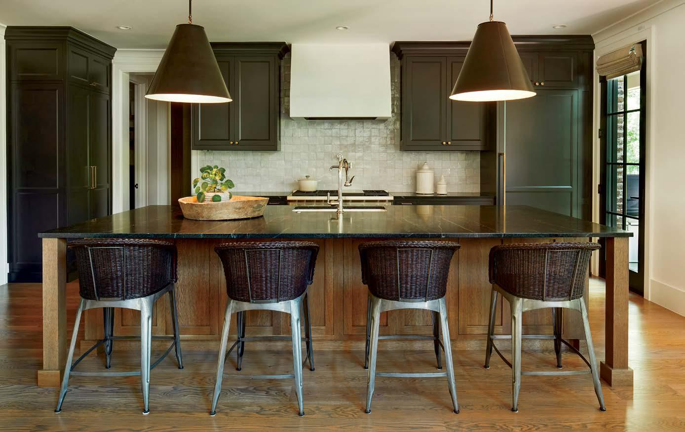 More glossy paint—this time emerald green, gives the feel of an old-timey pub room. Another star detail is the cocktail serving island Marks fashioned from an oversized antique French laundry basket purchased on a whim. “We spend a lot of time in there as a family; it’s cozy and intimate,” Marks re ects. “And whenever we have parties, it’s the room that everyone gravitates towards.” Coziness similarly de nes the breakfast nook, a sunken space off the kitchen where casual meals are enjoyed reside, ensconced in a green velvet banquette that echoes the tones of the bar.