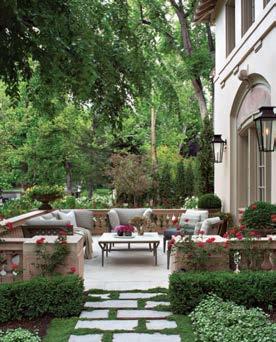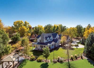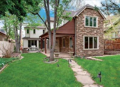 Top This farmhouse outside of Denver combines rural and modern influences alongside rich layers and textures. The water feature is built to resemble a natural stream. Far left A contemporary cabana is beautifully framed by native perennials that evoke the essence of a natural prairie. Center Collaborating with the exceptional builder Diamond Homes was critical to creating this space, both cozy and serene with an easy flow between indoor and outdoor spaces. Left An English-style courtyard exemplifies the beauty of a well-maintained landscape, from meticulously shaped topiaries to lush groundcover.