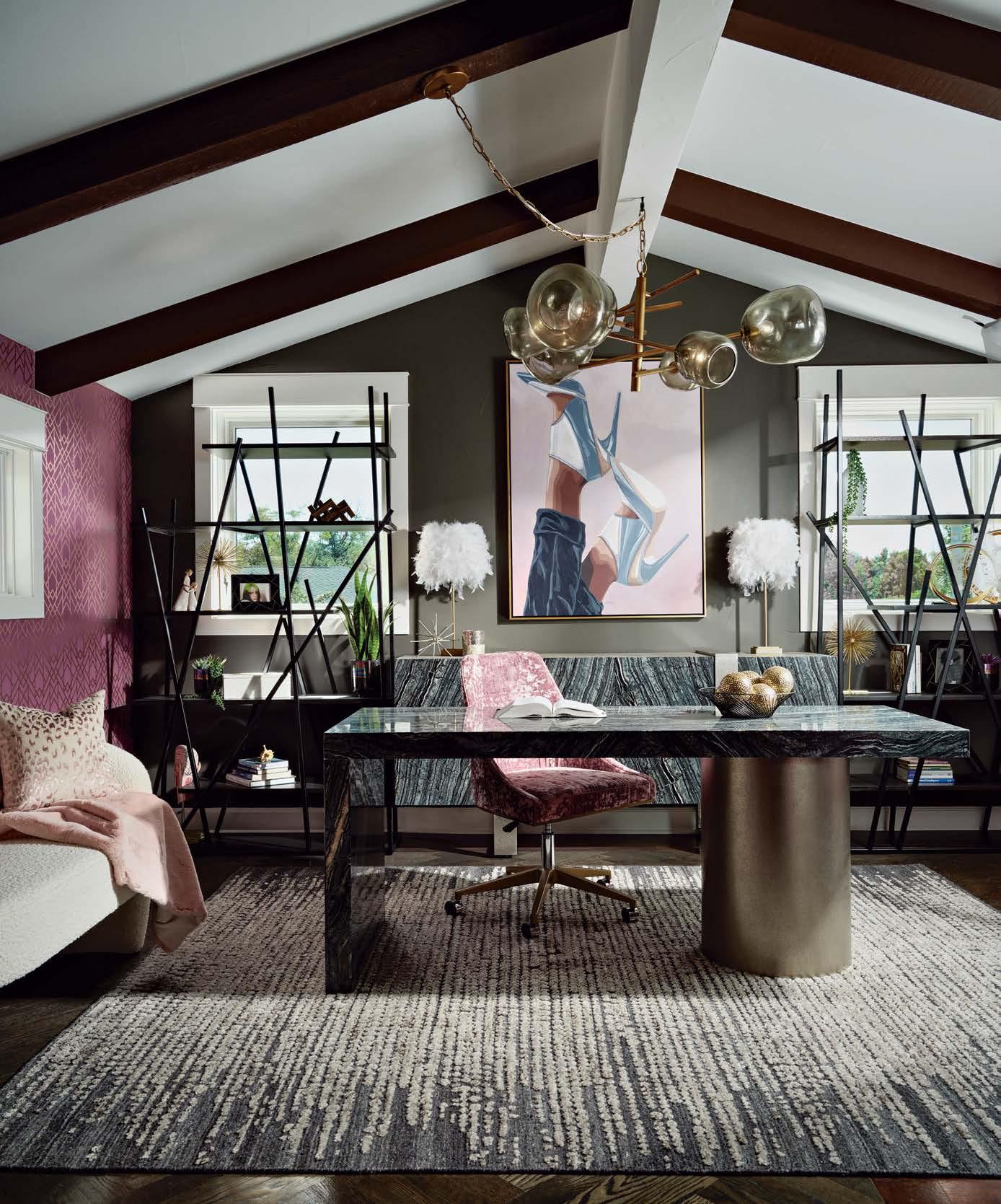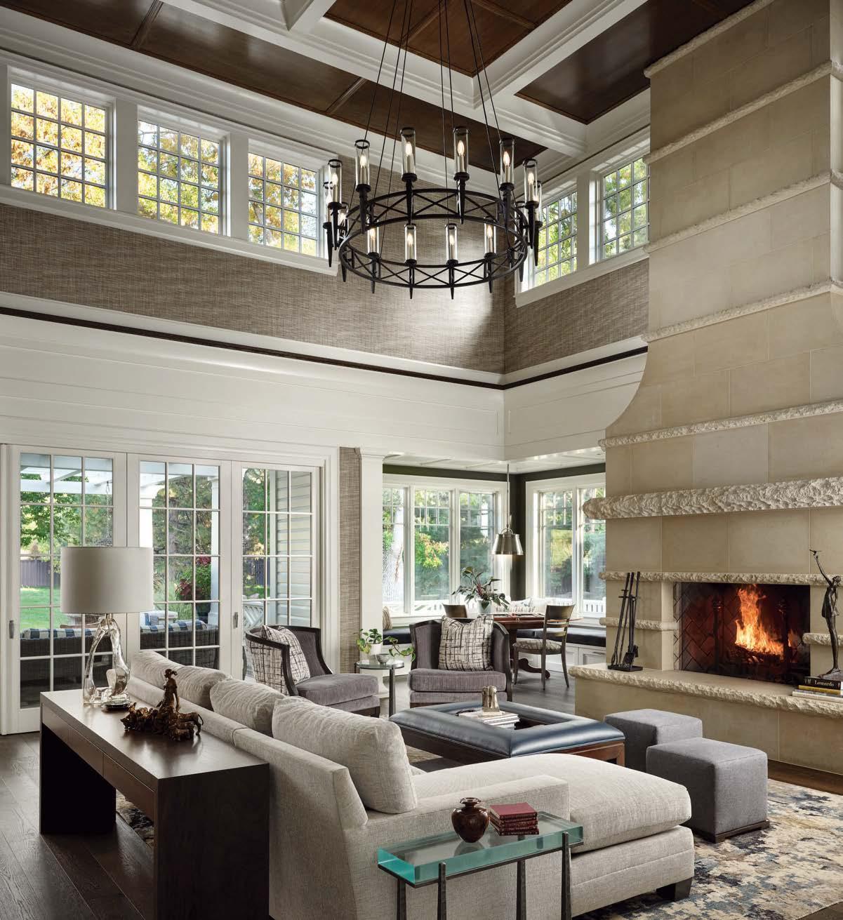 Two steel-and-glass fireplaces with Taj Mahal quartzite surrounds frame the great room. Atop an Isberian rug, club chairs, sofas and an accent chair and ottoman— all A.Rudin—gather around Holly Hunt tables. A custom Hubbardton Forge Griffin Starburst pendant crowns the space.