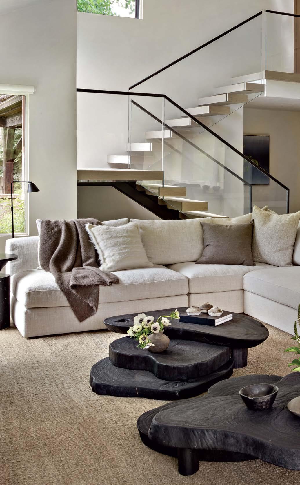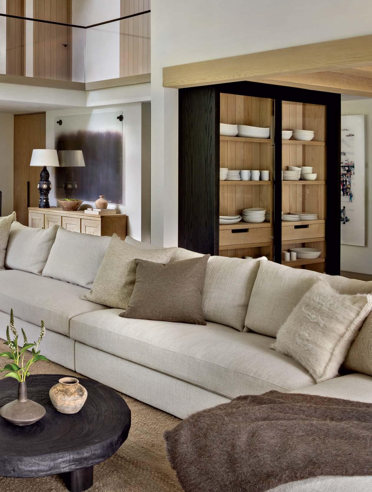 Anchored by an Awanay rug, a Poliform sectional from Studio Como easily seats a group. Mar Silver coffee tables—tree trunk slabs blackened with a shou sugi ban technique—add an organic touch. Grand Woodworks, Inc. built the custom cabinet.