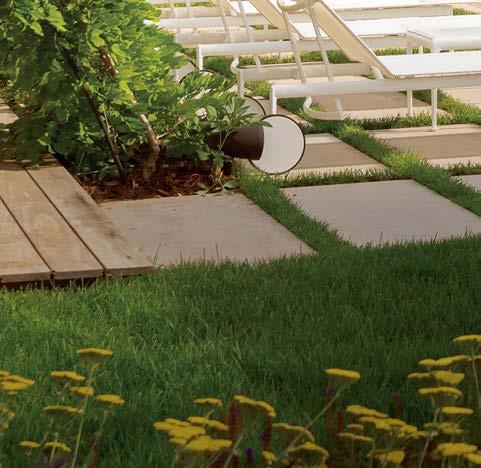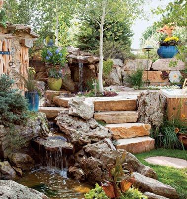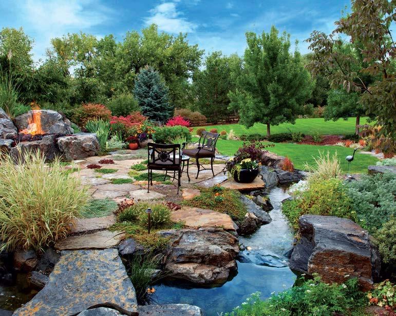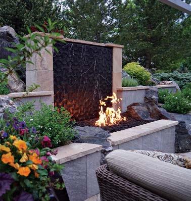 Top A meandering stream flows through this lush garden and leads to a peaceful koi pond that brings movement, sound and life to the space. Right Fire and water come together in this modern feature to create a warm, inviting space that draws people in for memorable evenings outdoors. Far right The ultimate outdoor spa experience, this earth house sauna, soaking tub and water feature blend into the landscape while offering relaxation and rejuvenation.