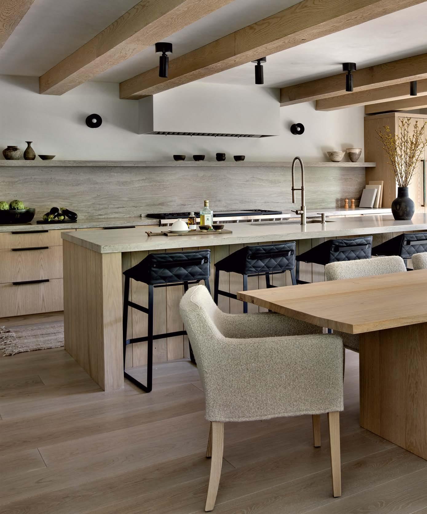 White oak cabinetry with counters and a backsplash of Pierreux limestone creates a clean look in the kitchen and dining area. Piet Boon stools line the island. The table and chairs are finds from the homeowner’s boutique, Bungalow, and the chandelier is Ochre.