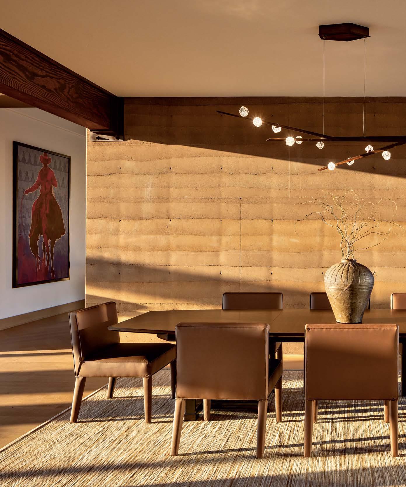Anchored by a rammed-earth wall, the dining room houses a Hickory Chair table, Jonathan Wesley Furniture leather chairs and a Stark rug. Hammerton Signature’s Verdi chandelier catches the light. Duke Beardsley’s work adorns the hall.