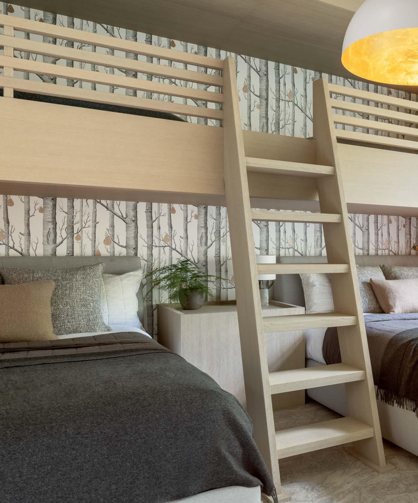 A Serena & Lily dome-shaped pendant overlooks the bunk room, with custom white oak queen beds on the bottom and twins atop. Metallic-accented Woods & Pears wallpaper by Cole & Son adds a whimsical note.