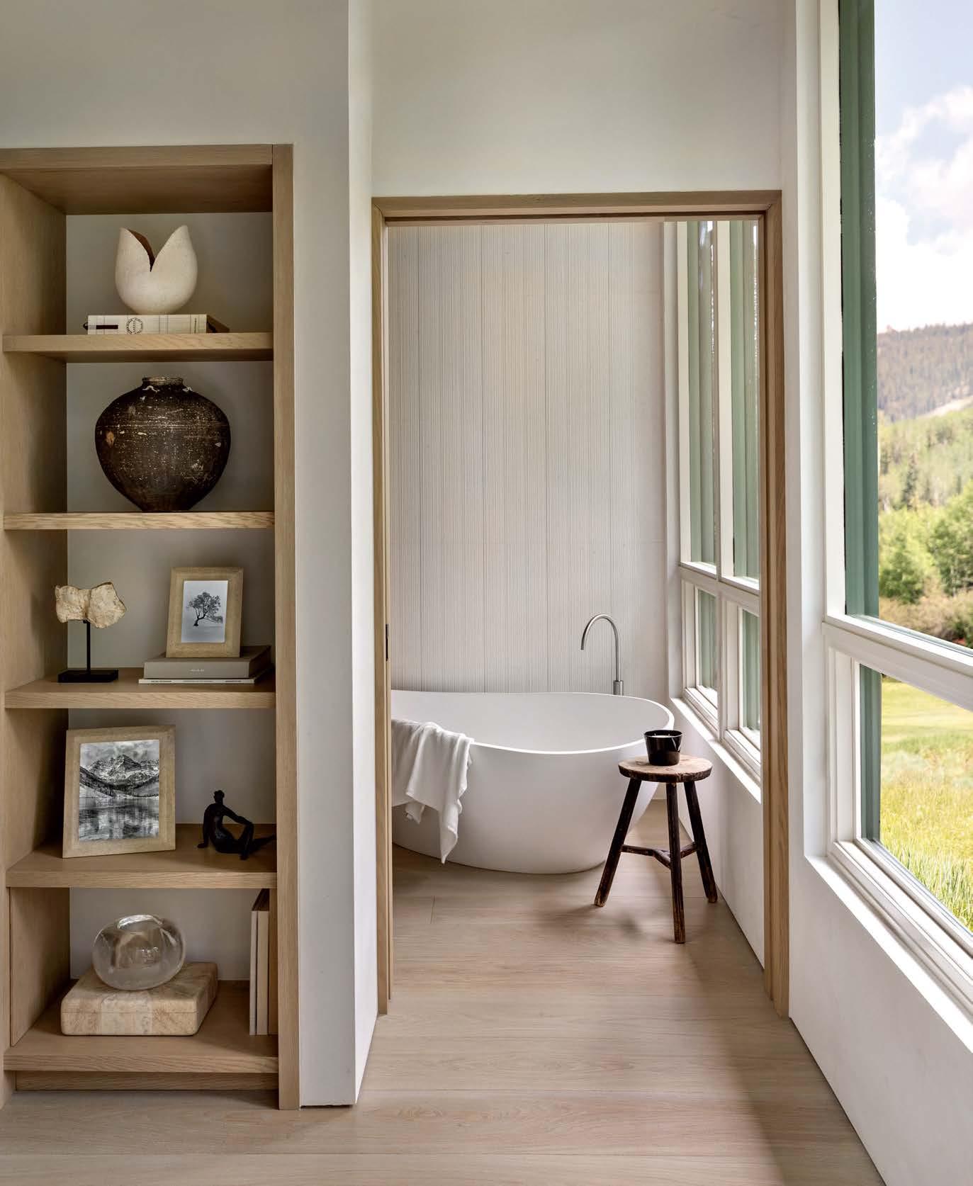 Opposite: White oak lines a custom display niche and the doorframe of the owner’s bath for a cohesive look. Salvatori limestone from Decorative Materials flows to the ceiling behind a tub fitted with Piet Boon hardware. The stool is vintage.
