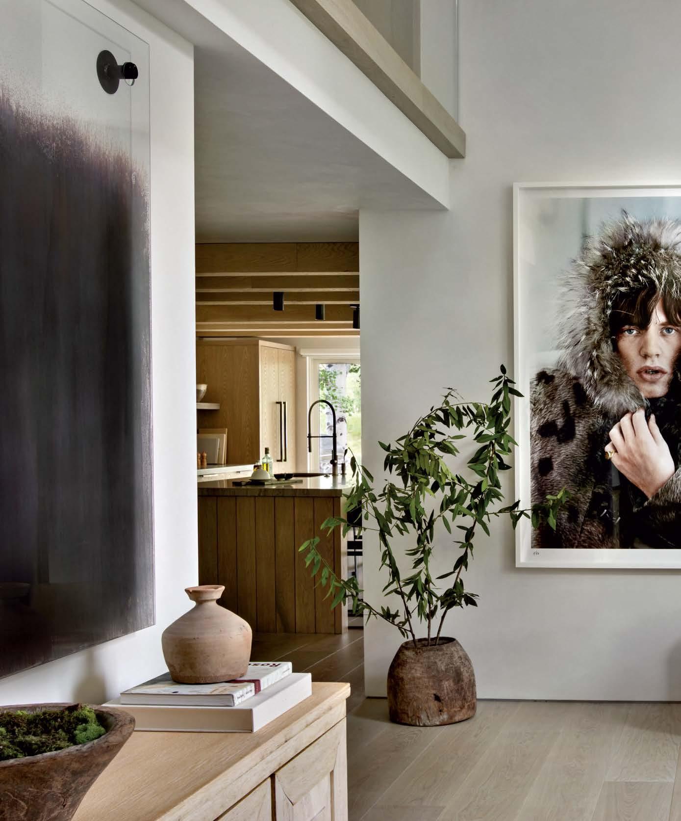 Previous page: A portrait of Mick Jagger by Terry O’Neill presides over the entry. Warm white limewash from Color Atelier provides a subtly textured backdrop here and throughout the home. European wood flooring from The Hudson Company spans the main level.